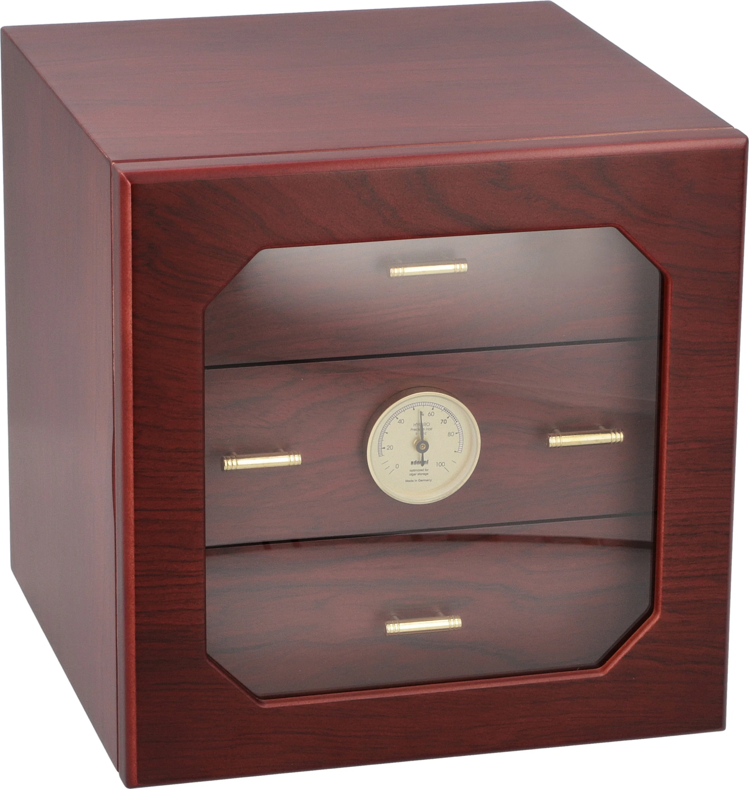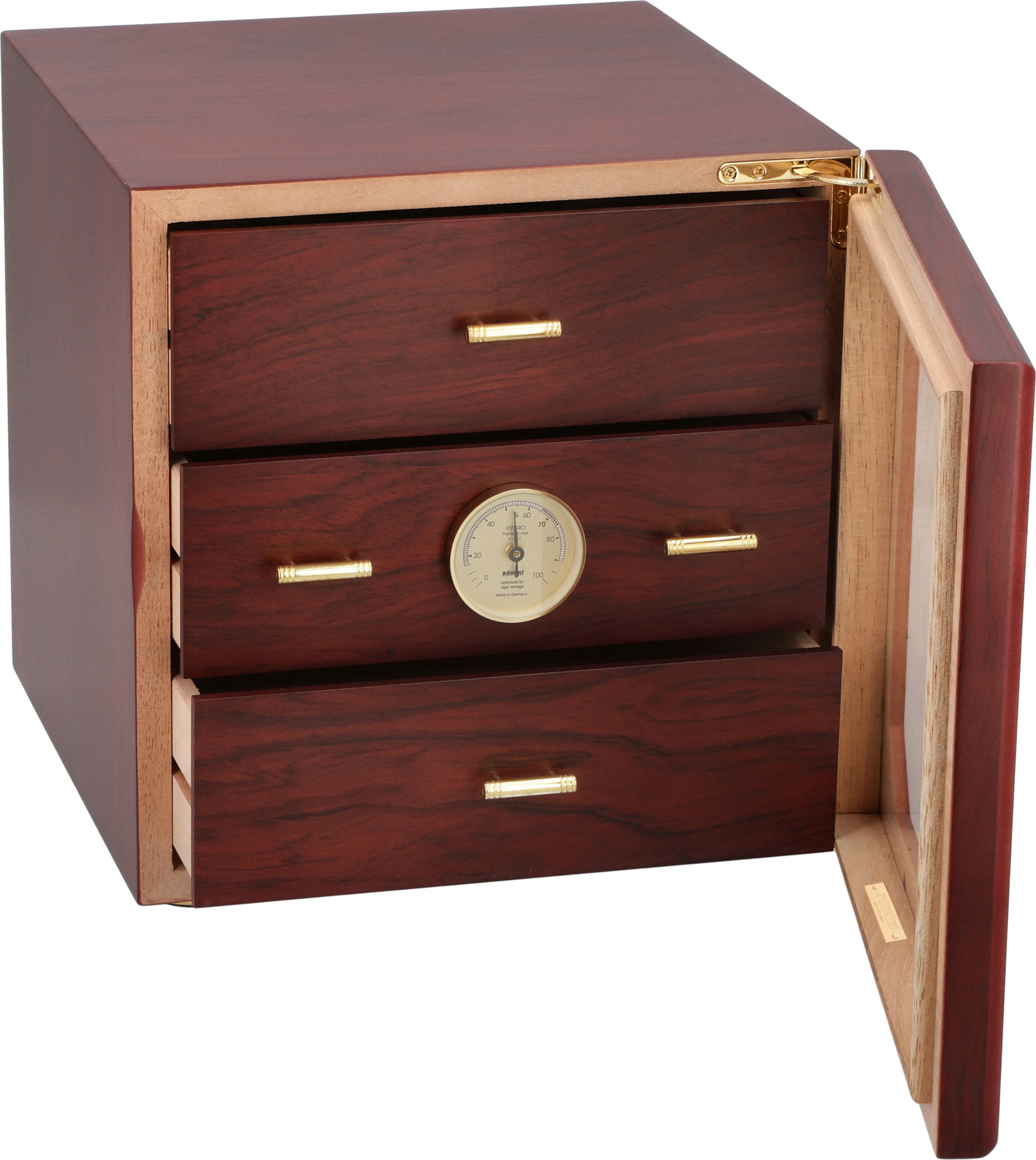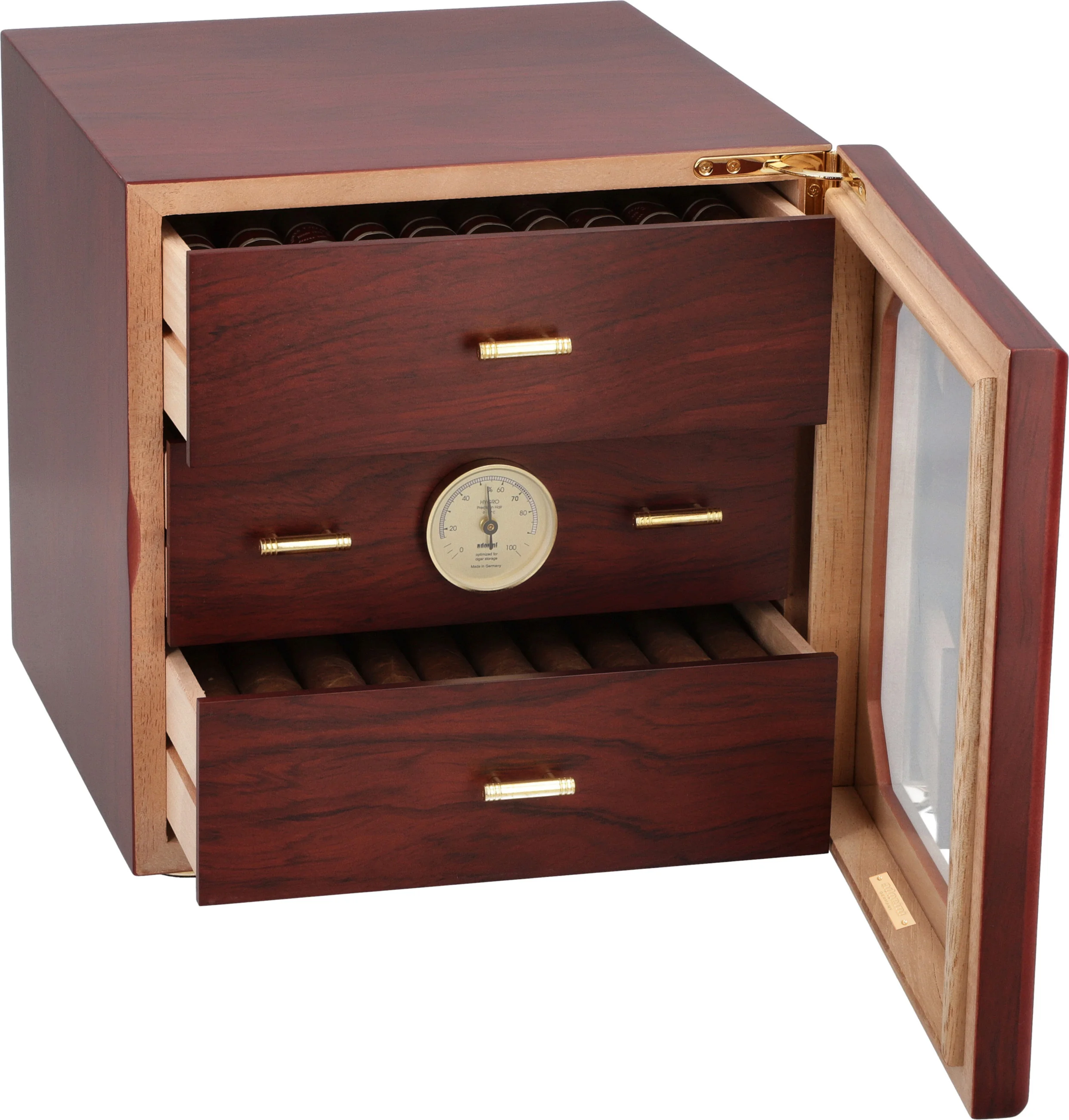A humidorban több mint 125 szabványos Corona méretű szivar fér el, amelyeket az adorini luxus aranyozott akril-polimer alapú párásítója tart optimális állapotban. Az állítható szellőzőnyílások segítségével finomíthatja a páratartalom szintjét, hogy megfeleljen a kívánt specifikációknak. A középső tálca elejére egy előre kalibrált precíziós hajszálhigrométer van felszerelve, amely csak egy gyors pillantást igényel a páratartalom szintjének ellenőrzéséhez, akár nyitva, akár zárva van a párásító.