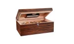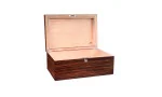 adorini Humidor ébenfa Basic L A Basic sorozat L méretű modern és funkcionális humidora az adorini márkától matt ébenfa felületével és sokoldalúságával nyűgöz le. Kb. 150 szivar vagy kisebb szivardobozok biztonságos tárolására alkalmas, így ideális megoldást kínál szivarjai számára. A csomag tartalmaz egy analóg higrométert és egy passzív szivacsos párásítót. A higrométer egy fémspirál elvén méri a páratartalmat, és mágnesesen, rugalmasan rögzíthető a humidor fedeléhez a párásítóval együtt. A humidor zárral van ellátva az illetéktelen hozzáférés elleni védelem érdekében, a tartozékok között két kulcs is található. A belső térben matt ezüst zsanérok és egy különösen erős tömítőperem gondoskodik az optimális páratartalom fenntartásáról. Egy függőleges elválasztó segíti a belső tér további tagolását. A humidorhoz egy kivehető, lépcsőzetes tálca is tartozik, amely esztétikusan és praktikusan rendszerezi a szivarokat. A tálcán szellőzőnyílások biztosítják a páratartalom egyenletes keringését. Műszaki adatok:
