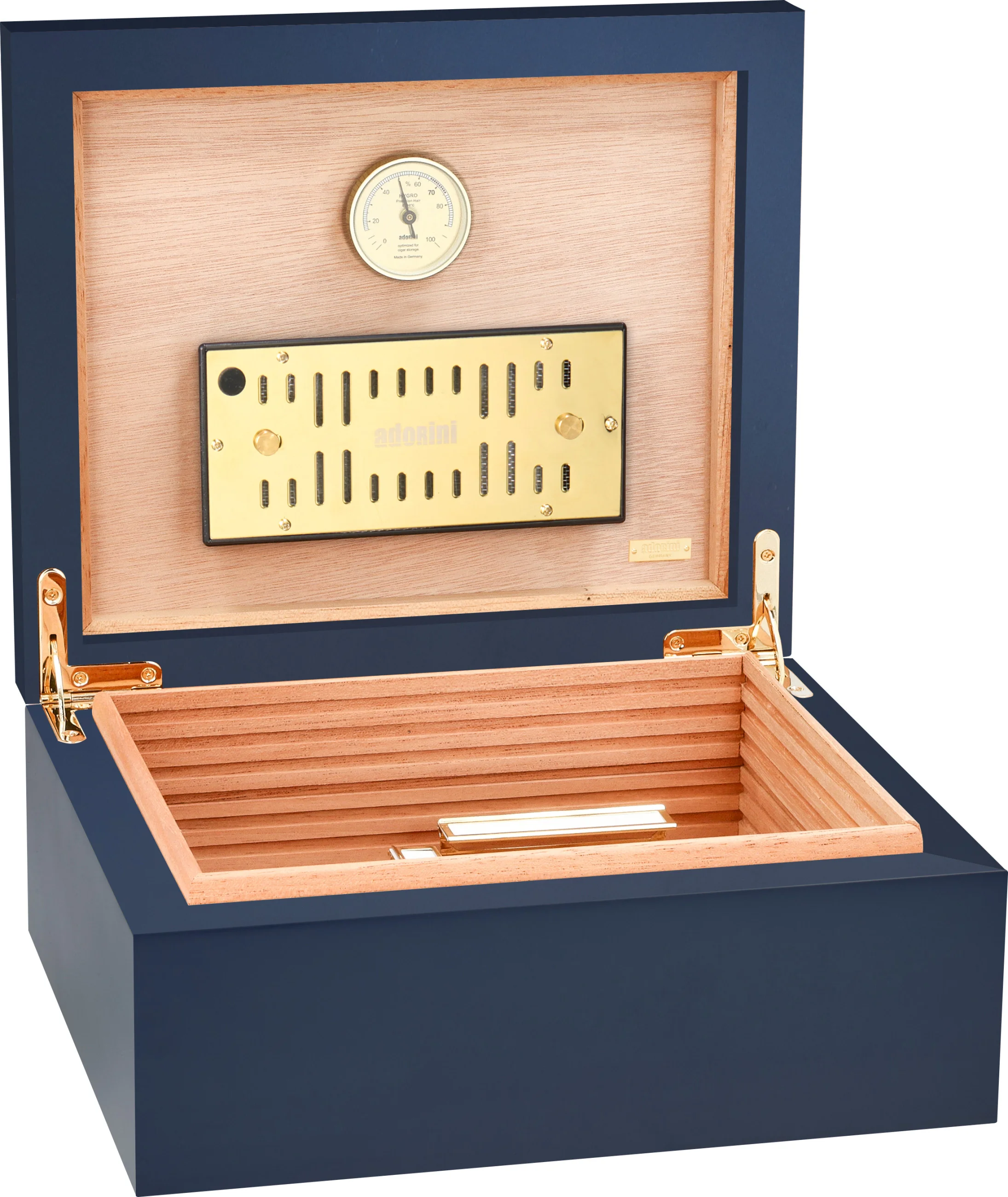 Az adorini Humidor Medium Deluxe Midnight Blue Midnight Blue az új adorini kollekció része, négy izgalmas színvariációban. Ez a modell kifinomult, időtlen sötétkék színével nyűgöz le, amelyet a belső térben arany elemek egészítenek ki. Különösen figyelemre méltó a matt kék soft-touch kivitel, amely túlnyúlik a külső peremen, és így a belső térben is látható. Ez harmonikus és elegáns összhatást kölcsönöz a humidornak.