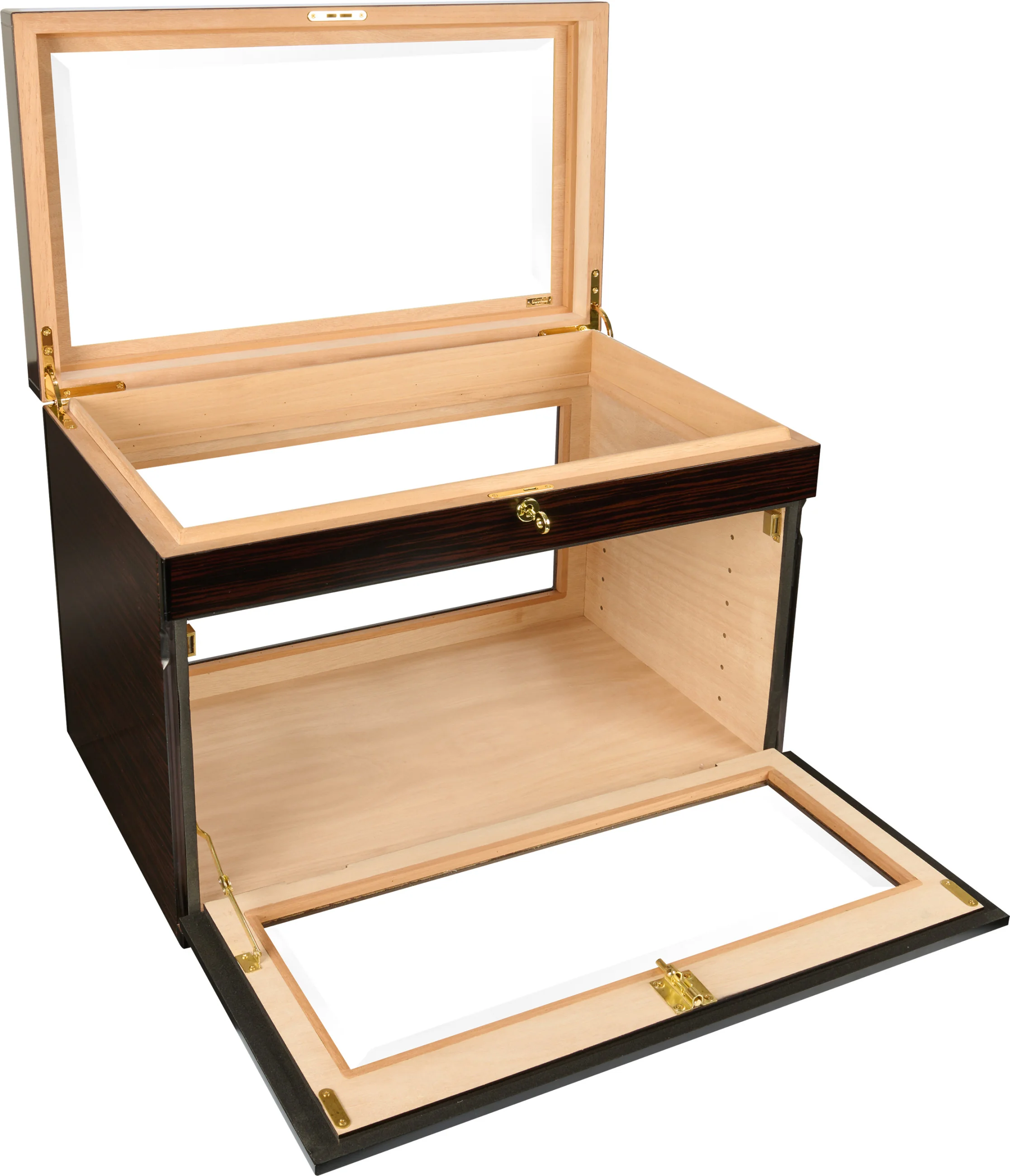 - Optional trays for individual cigars and boxes can be inserted and optionally angled for optimal presentation.