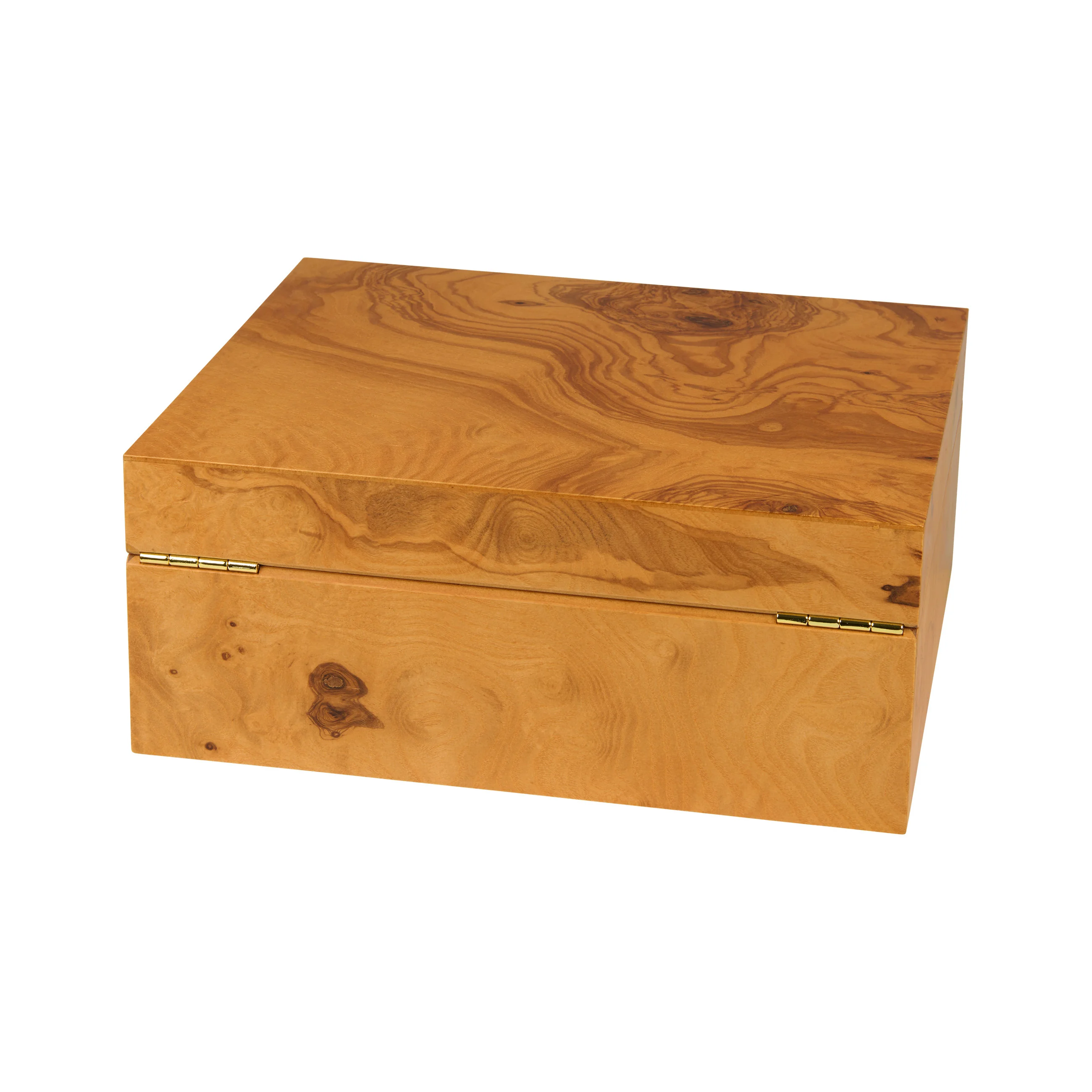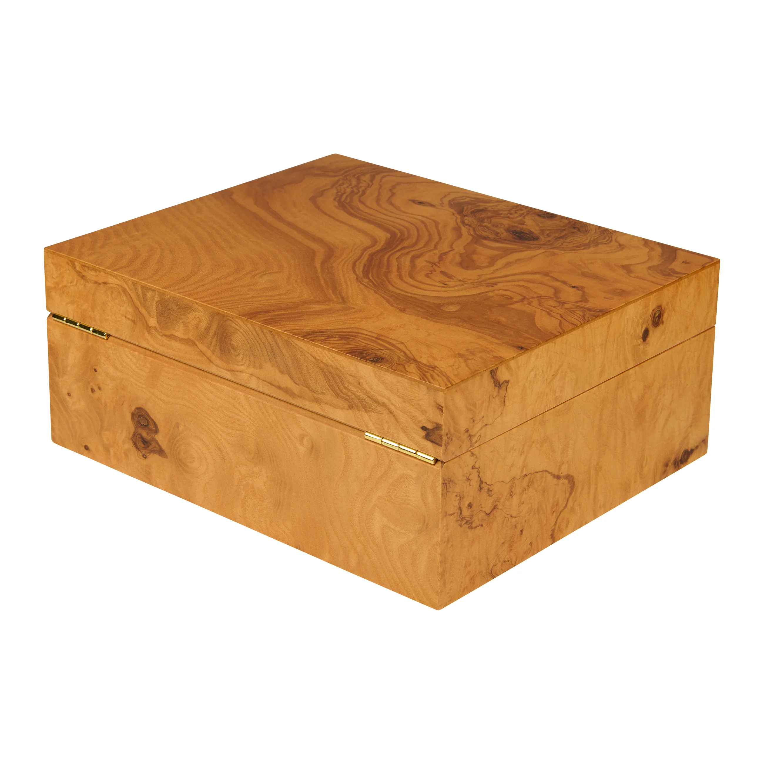 The horizontal and vertical dividers and the label clips allow for even more stylish organization and partitioning of the interior. Adorned with gold elements such as the lock and hinges, the interior presents a harmonious overall impression in combination with the olive wood veneer.