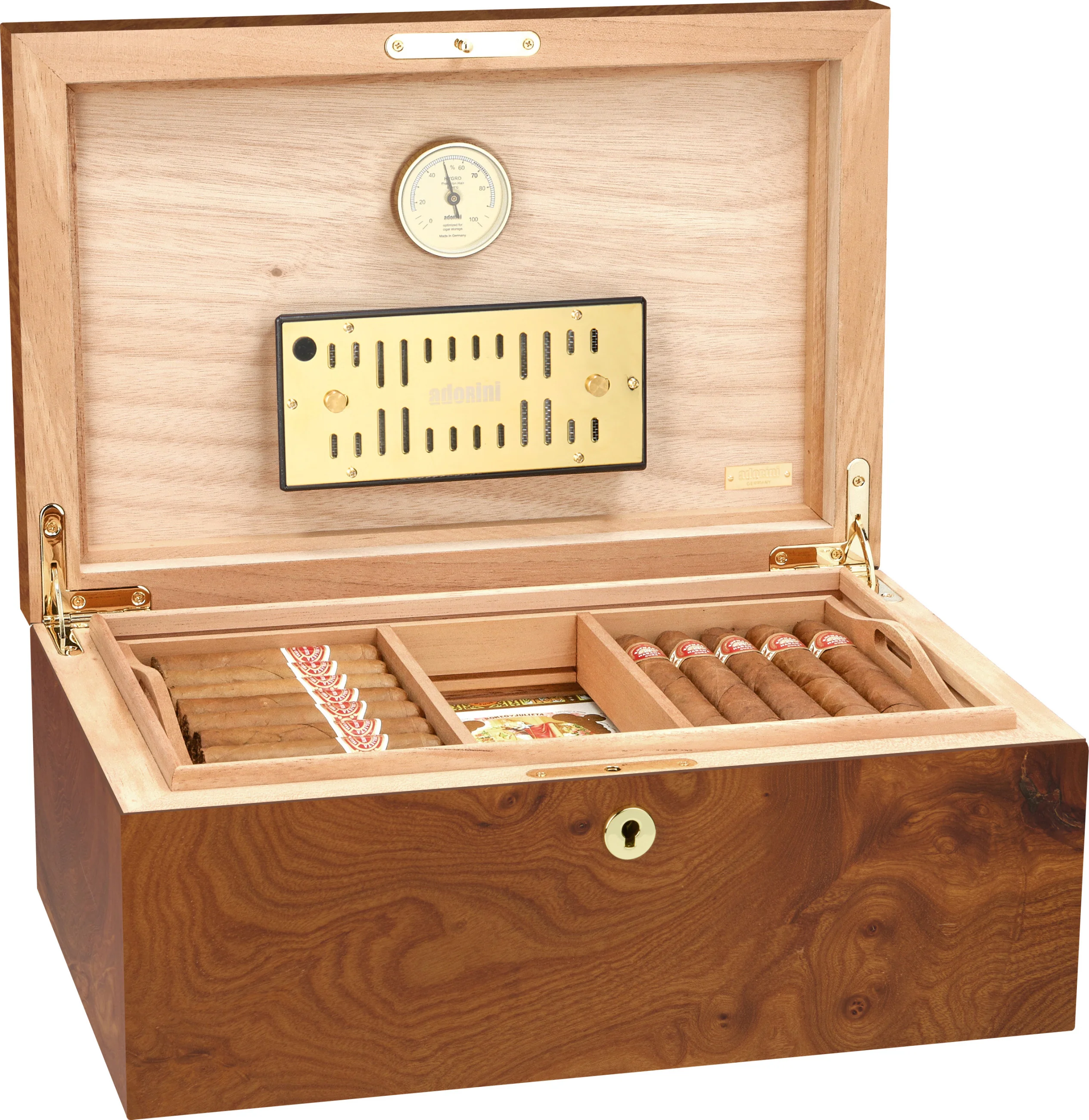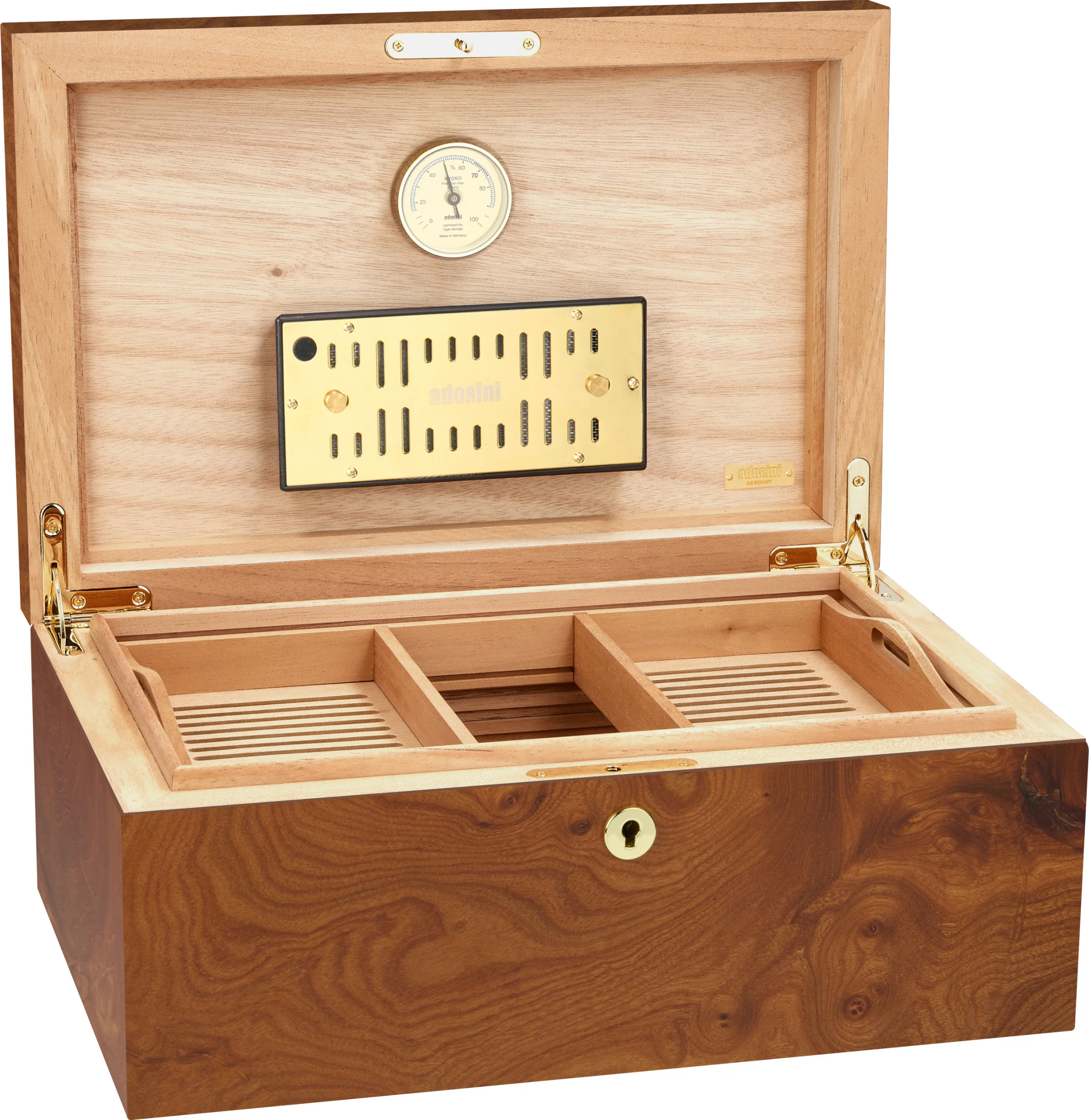 The Elm model impresses with a warm brown tone with clearly visible grain, creating a particularly elegant appearance. The Grande humidors hold up to 150 cigars, offering ample space for the collection of discerning connoisseurs.
