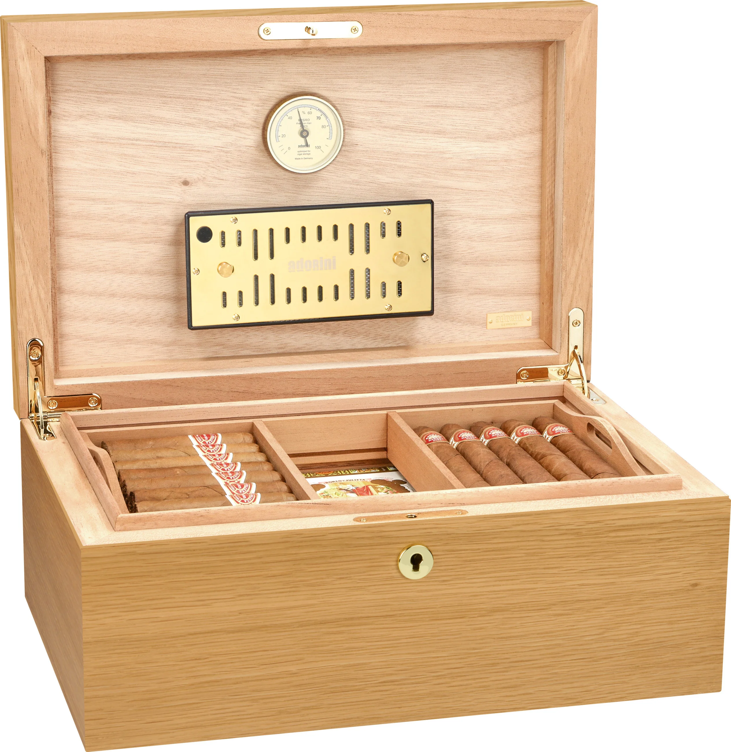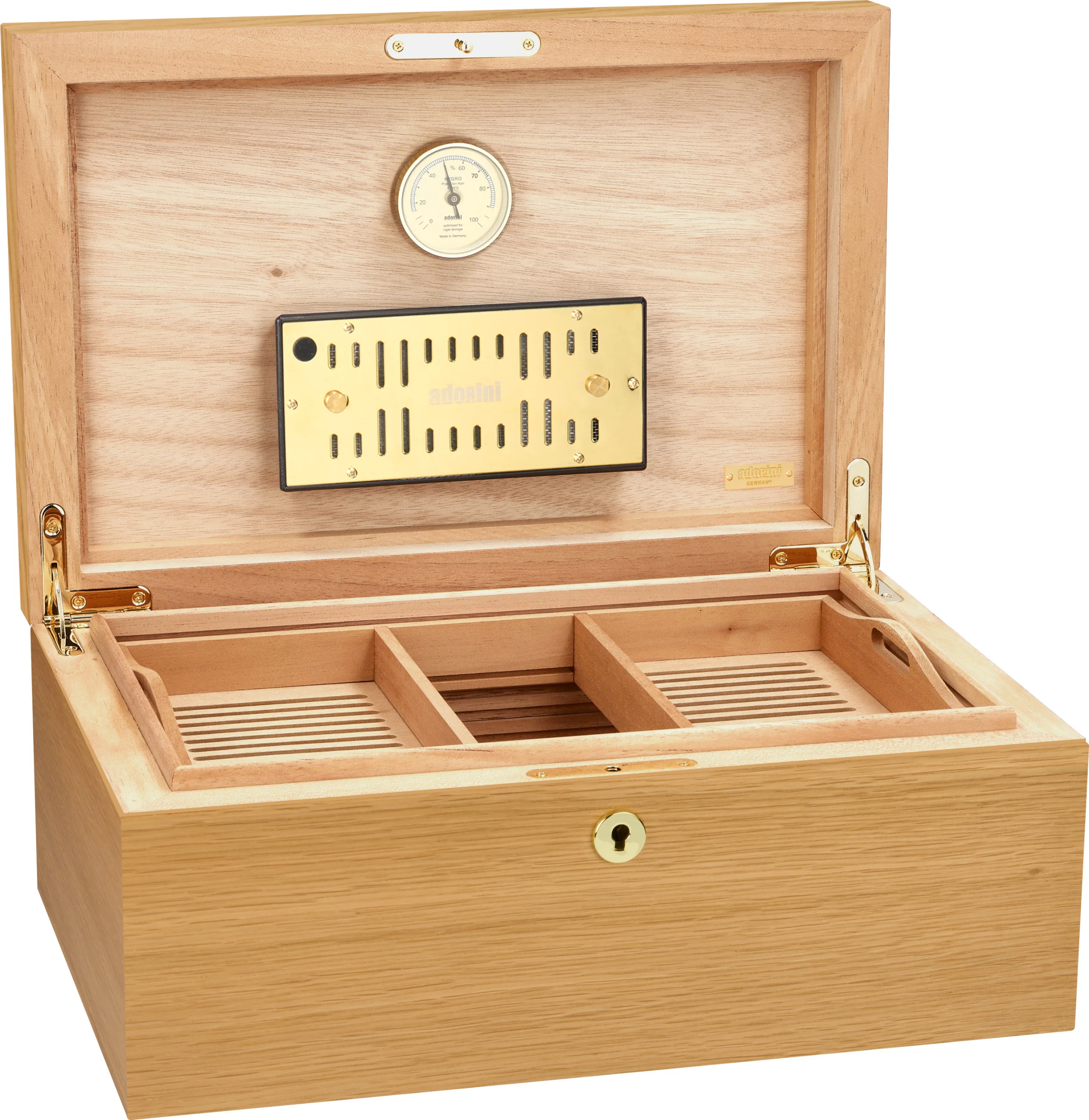 A tölgyfa modell világos bézs színével és finom szemcsézettségével nyűgöz le, amely különösen elegáns hatást kelt, és tökéletesen illeszkedik bármilyen környezetbe. A Grande humidorok akár 150 szivar tárolására is alkalmasak, így bőséges helyet kínálnak az igényes ínyencek gyűjteményének.