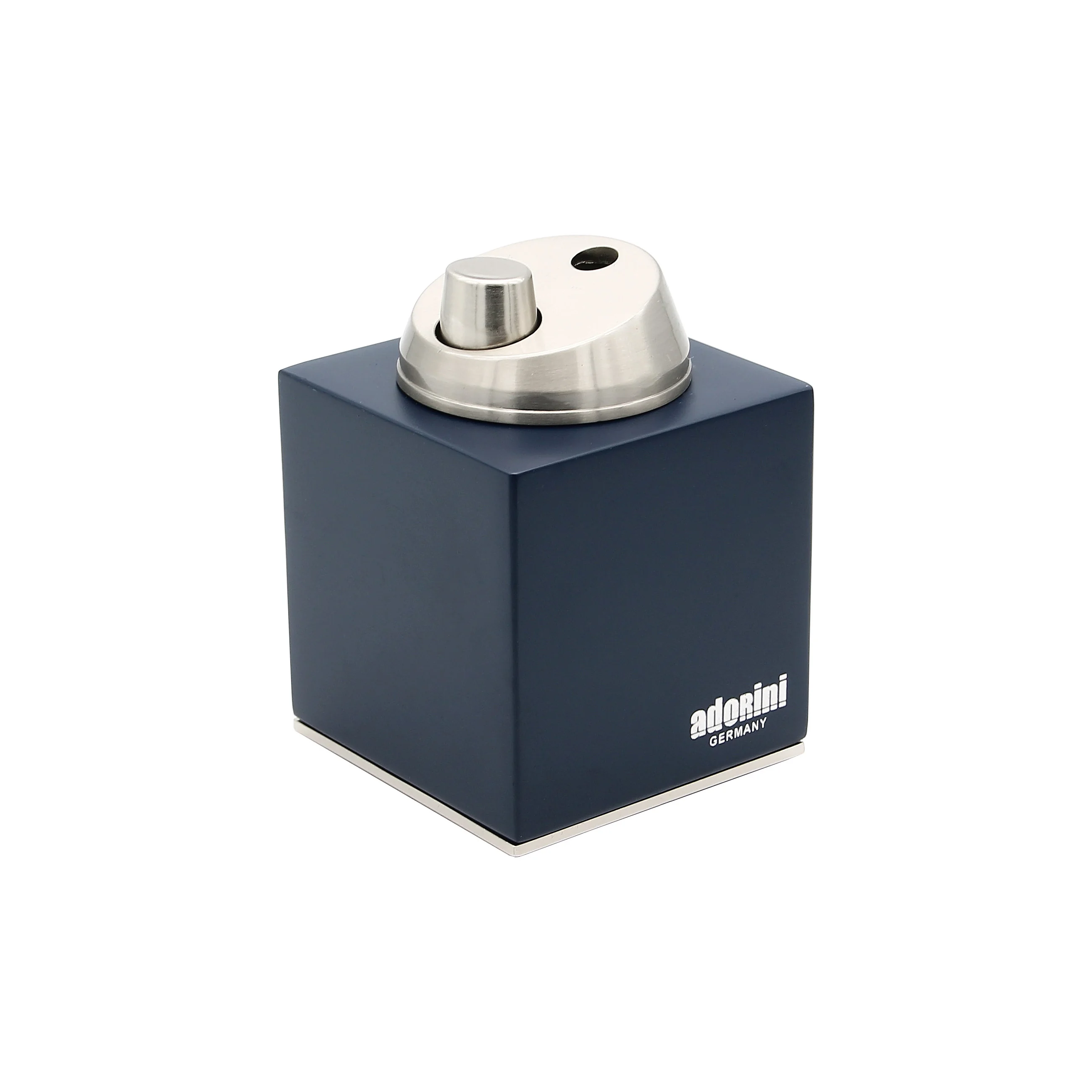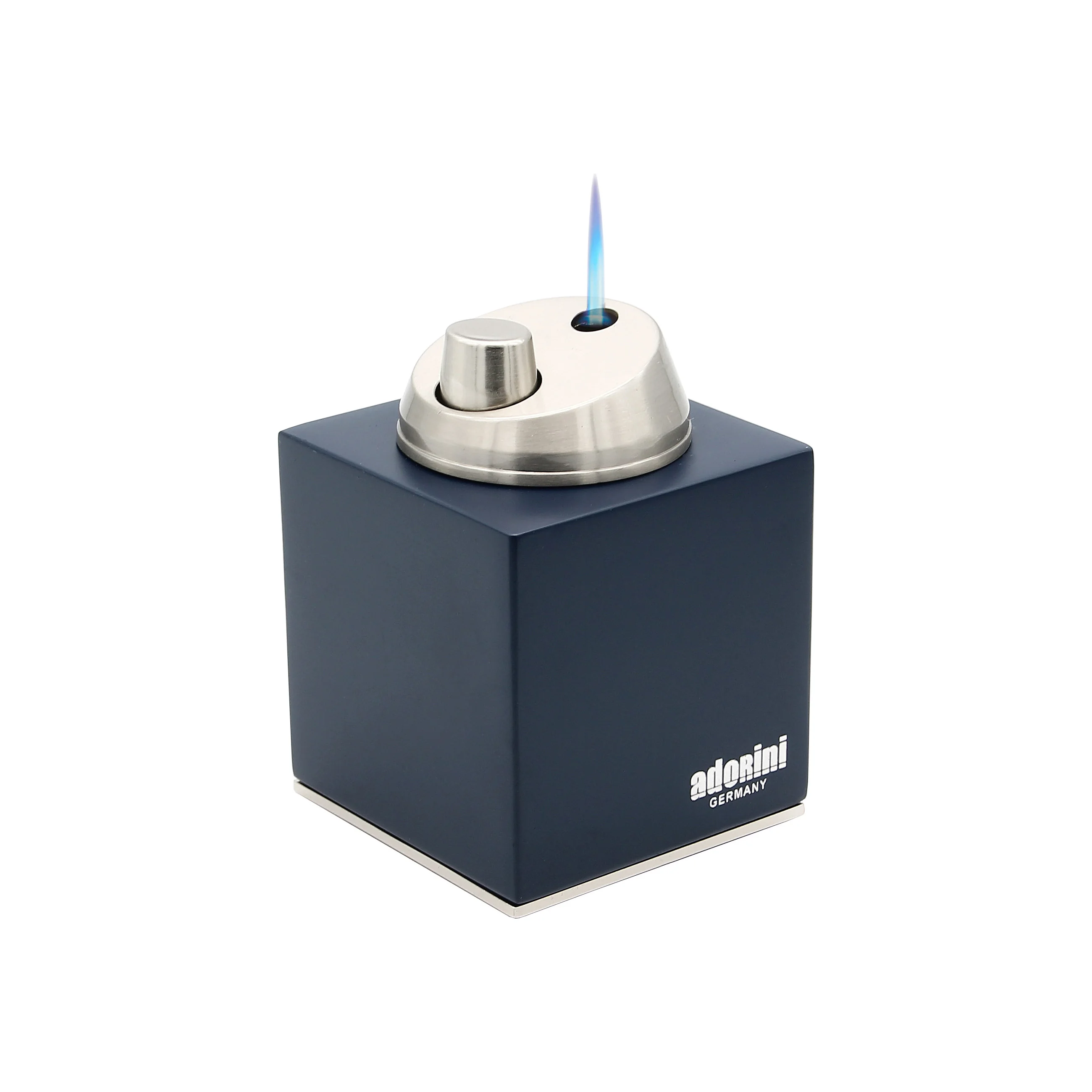 This elegant adorini table lighter with jet flame combines sophisticated design with high-quality functionality. The matte blue wooden body makes an impressive statement, perfectly accentuated by the chrome-plated ignition and the decorative rim at the base.