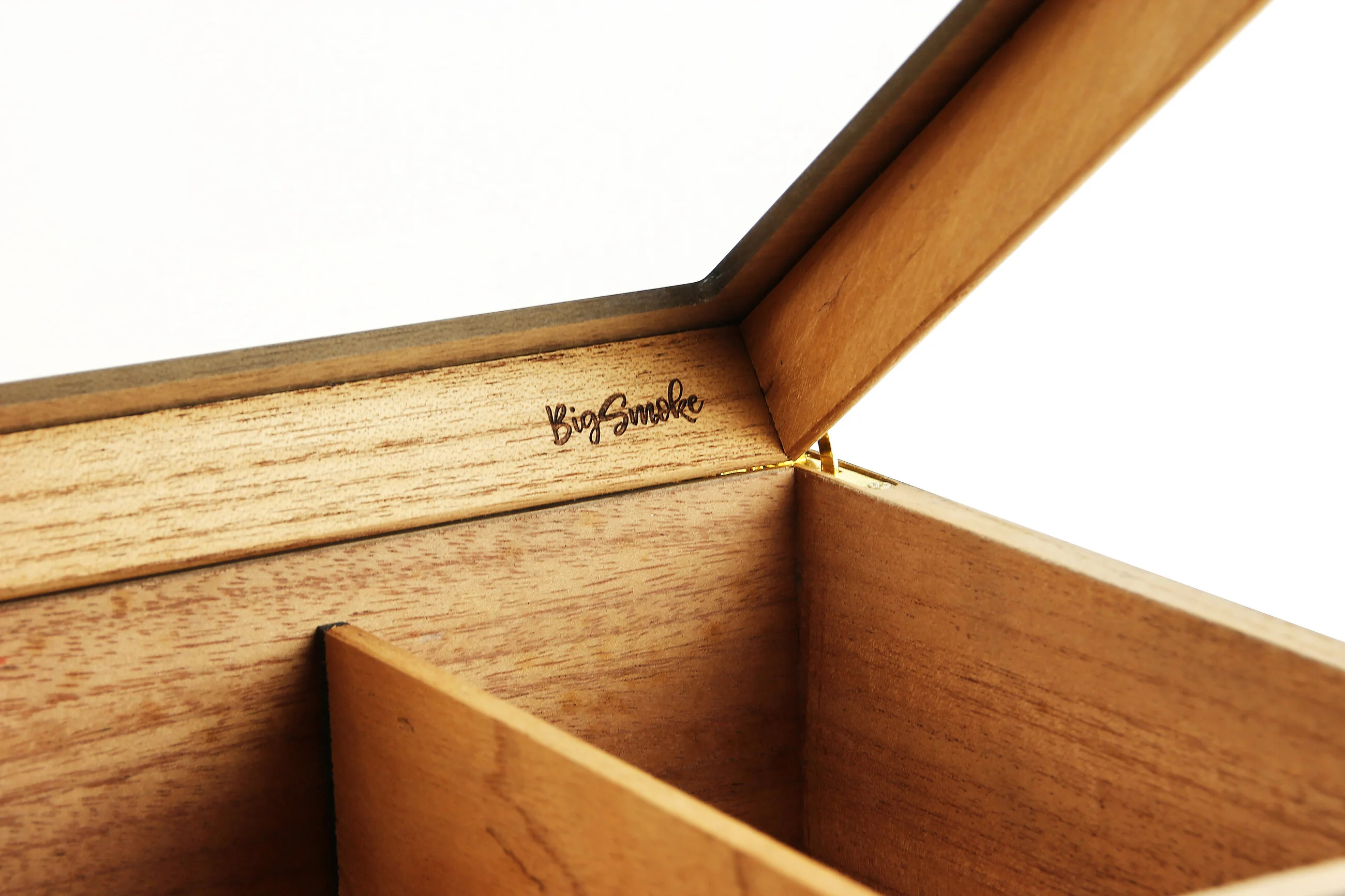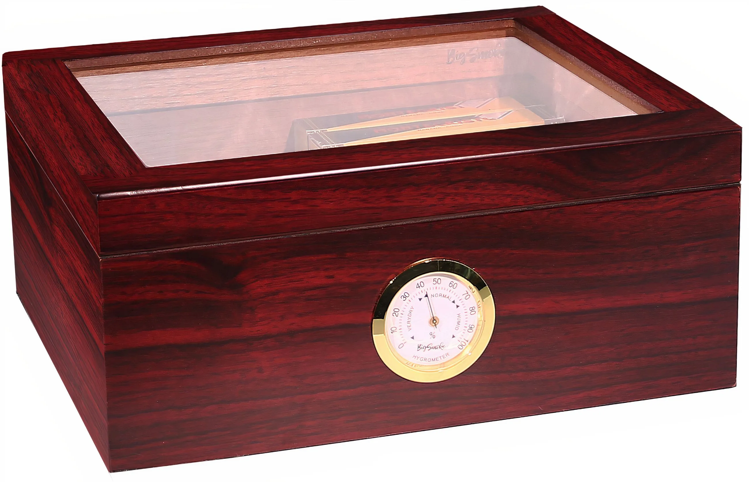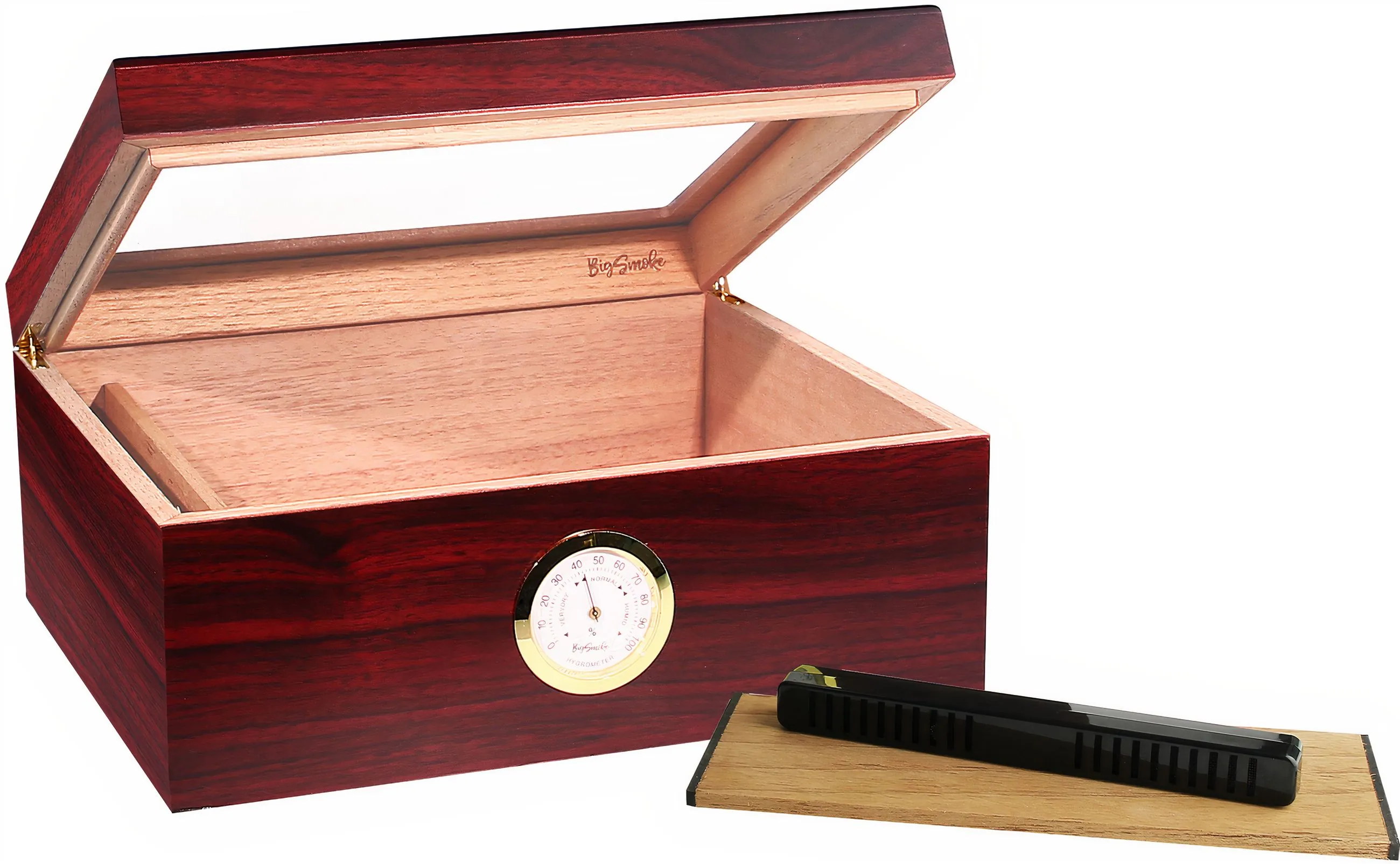 A BigSmoke elegáns humidora kb. 50 szivartárolására alkalmas, így ideális választás értékes szivargyűjteménye számára. A belső tér kisebb szivardobozok elhelyezésére is tökéletesen megfelel. A humidor elegáns, erezett felületét egy üvegtető egészíti ki, amely lehetővé teszi a belső tartalom megtekintését anélkül, hogy fel kellene nyitni a fedelet. A fémspirálos analóg higrométer a humidor elejébe van beépítve, így mindig könnyen leolvasható. A mellékelt párásító rúd akril polimer kristályokon alapul, és segít a megfelelő páratartalom fenntartásában. A függőleges elválasztó rugalmasan alakítható belső tagolást tesz lehetővé, míg az aljzat filccel borított, hogy megvédje a bútorfelületeket a karcolódástól.