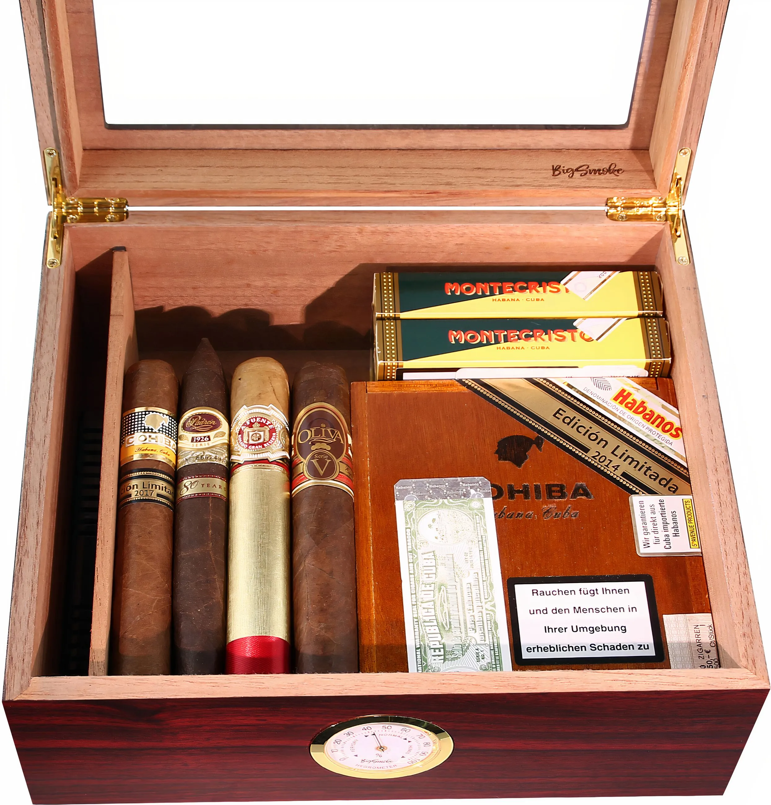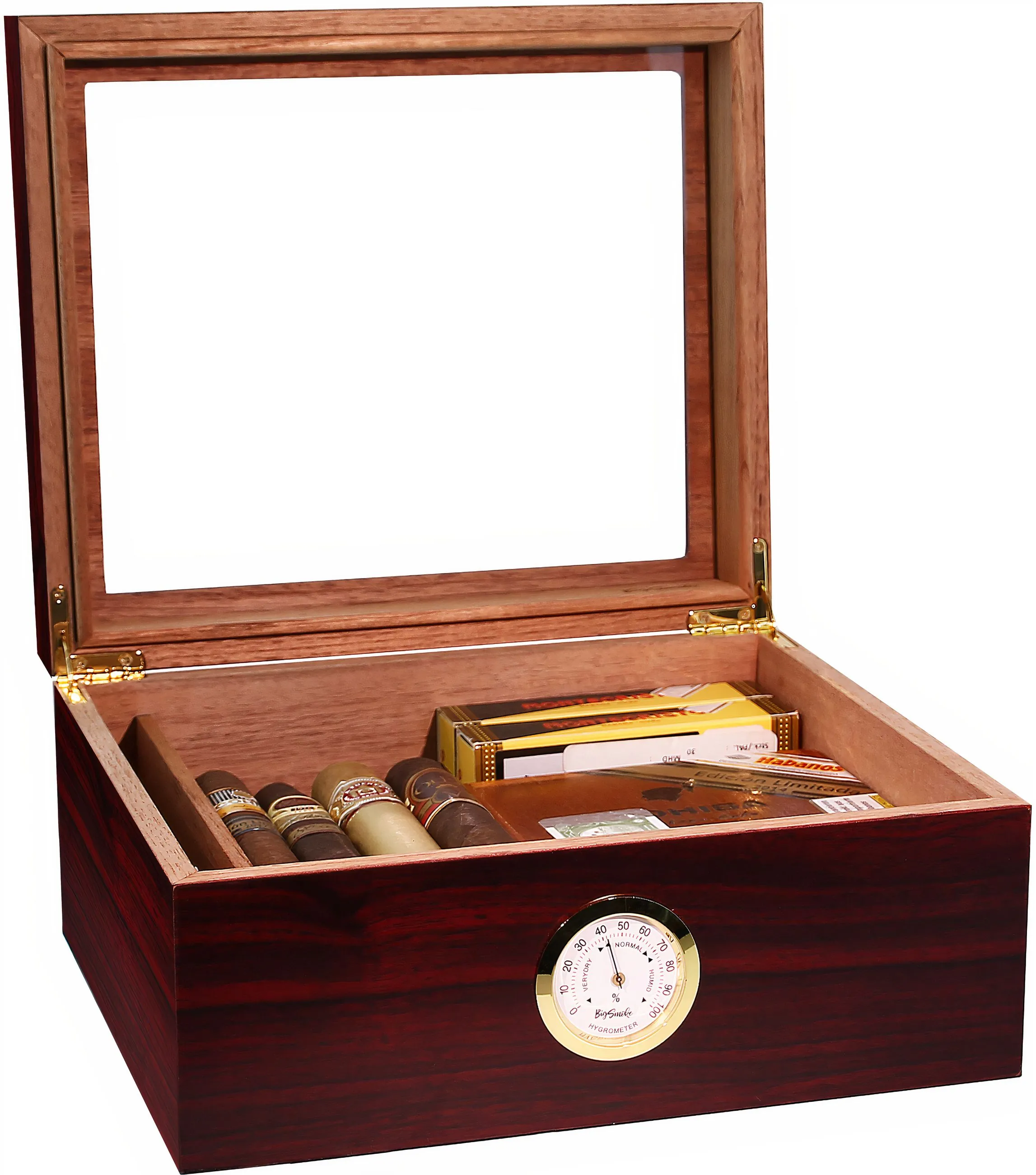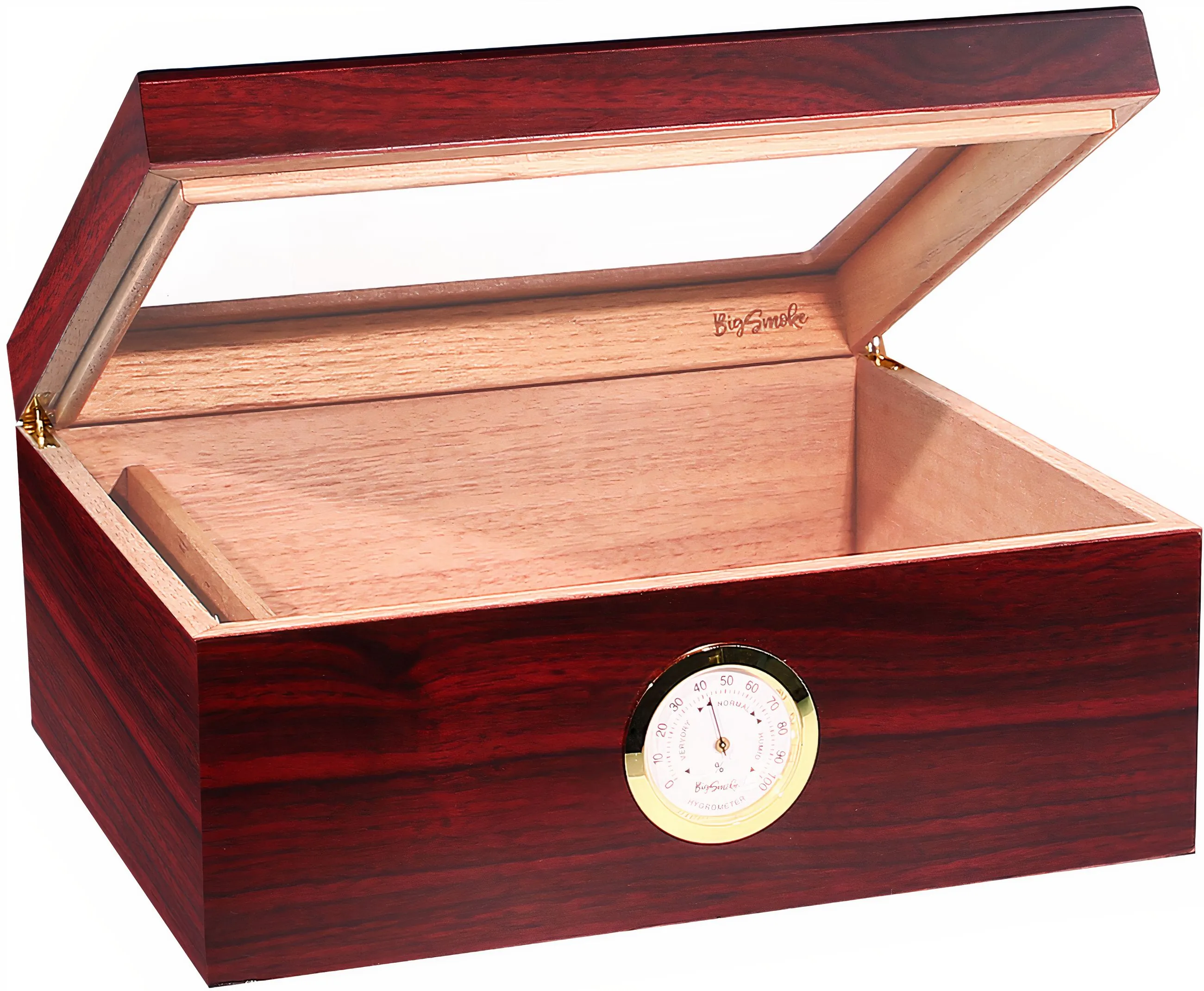 A BigSmoke elegáns humidora kb. 50 szivartárolására alkalmas, így ideális választás értékes szivargyűjteménye számára. A belső tér kisebb szivardobozok elhelyezésére is tökéletesen megfelel. A humidor elegáns, erezett felületét egy üvegtető egészíti ki, amely lehetővé teszi a belső tartalom megtekintését anélkül, hogy fel kellene nyitni a fedelet. A fémspirálos analóg higrométer a humidor elejébe van beépítve, így mindig könnyen leolvasható. A mellékelt párásító rúd akril polimer kristályokon alapul, és segít a megfelelő páratartalom fenntartásában. A függőleges elválasztó rugalmasan alakítható belső tagolást tesz lehetővé, míg az aljzat filccel borított, hogy megvédje a bútorfelületeket a karcolódástól.