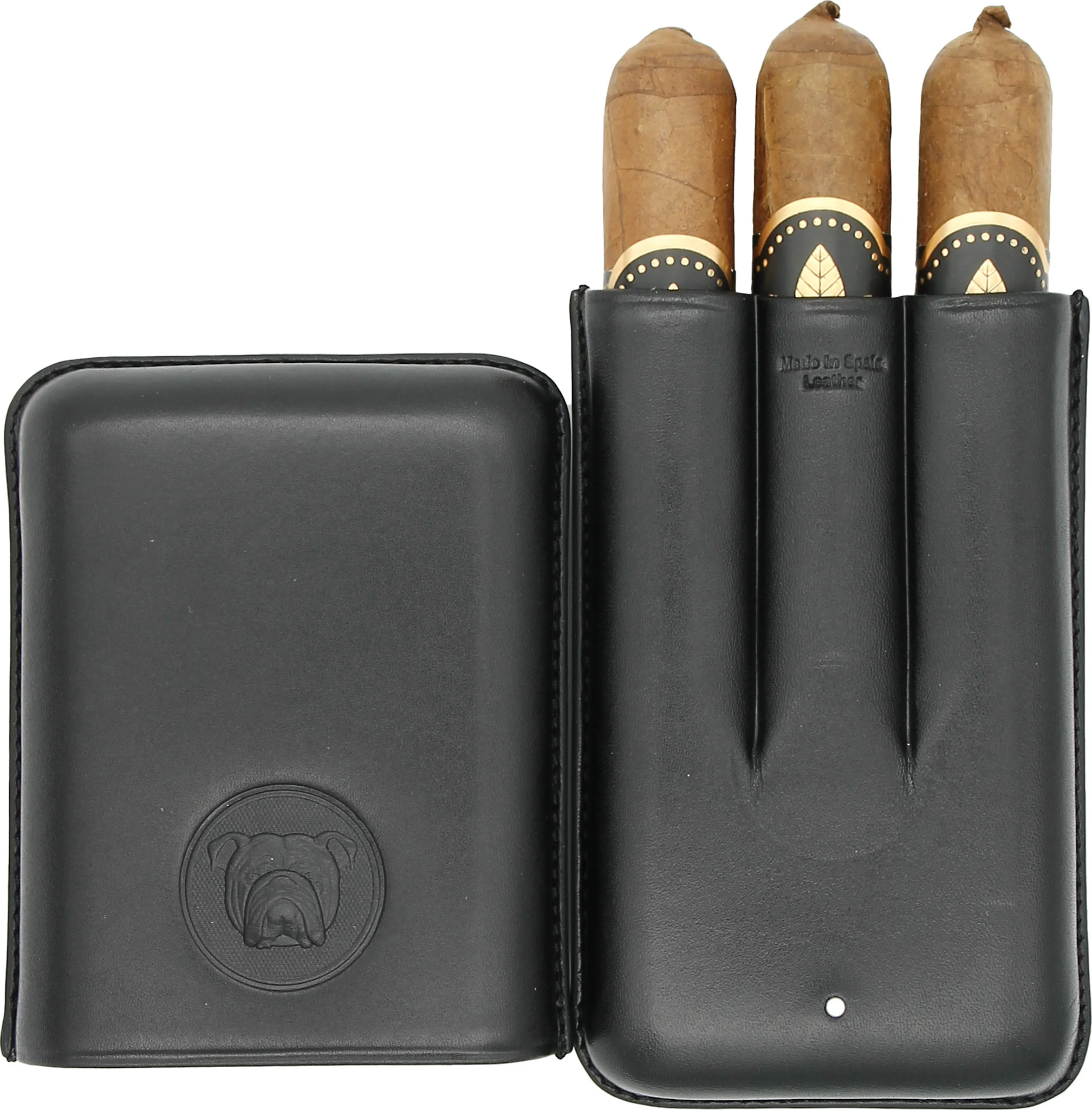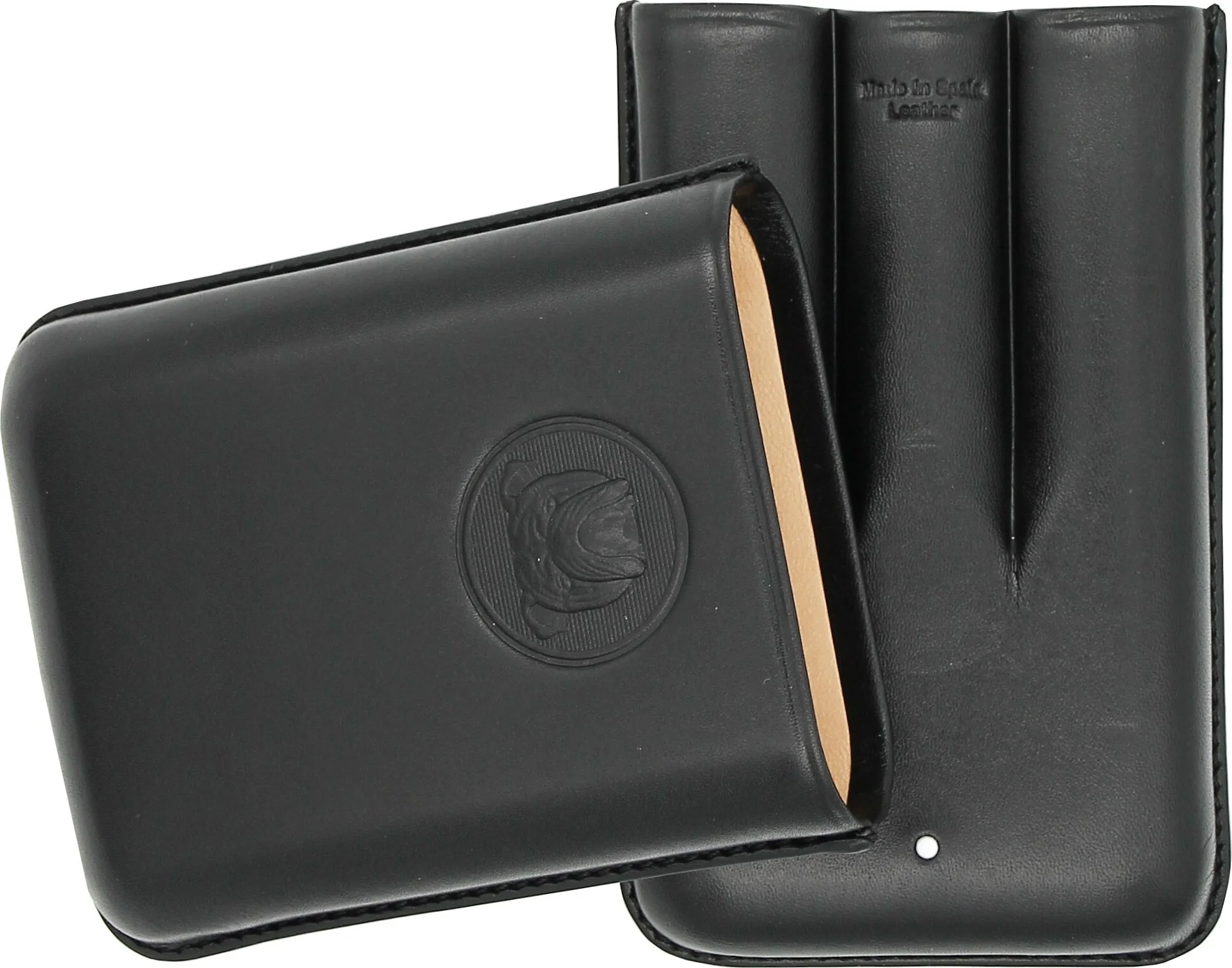 Inside, the case offers space for three cigars of different sizes. Practical notches ensure secure hold during transport. The interior is lined with soft, light-colored leather and reliably protects the cigars.