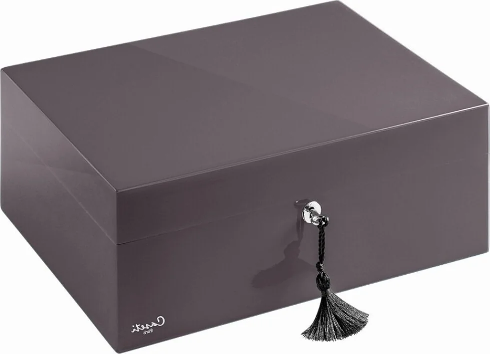 A Caseti Humidor Paris sötétlila színben egy kifinomult humidor a francia Caseti márkától, amely azonnal magára vonja a figyelmet magas fényű felületével. A Paris-sorozat szokatlan színeket képvisel, és egyértelműen kitűnik a klasszikus, gyakran látott fa furnér humidorok közül.