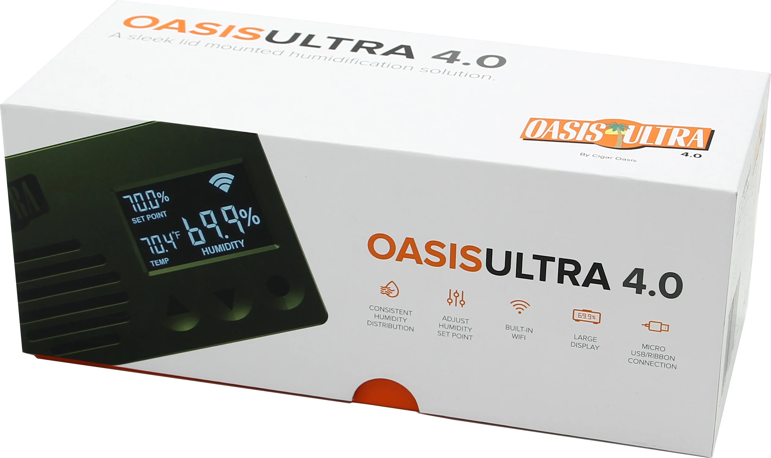 The Cigar Oasis Ultra 4.0 is factory-set to a target humidity of 70% relative humidity. If the humidity drops below this value, the integrated fan automatically activates to return the humidity to the desired level.