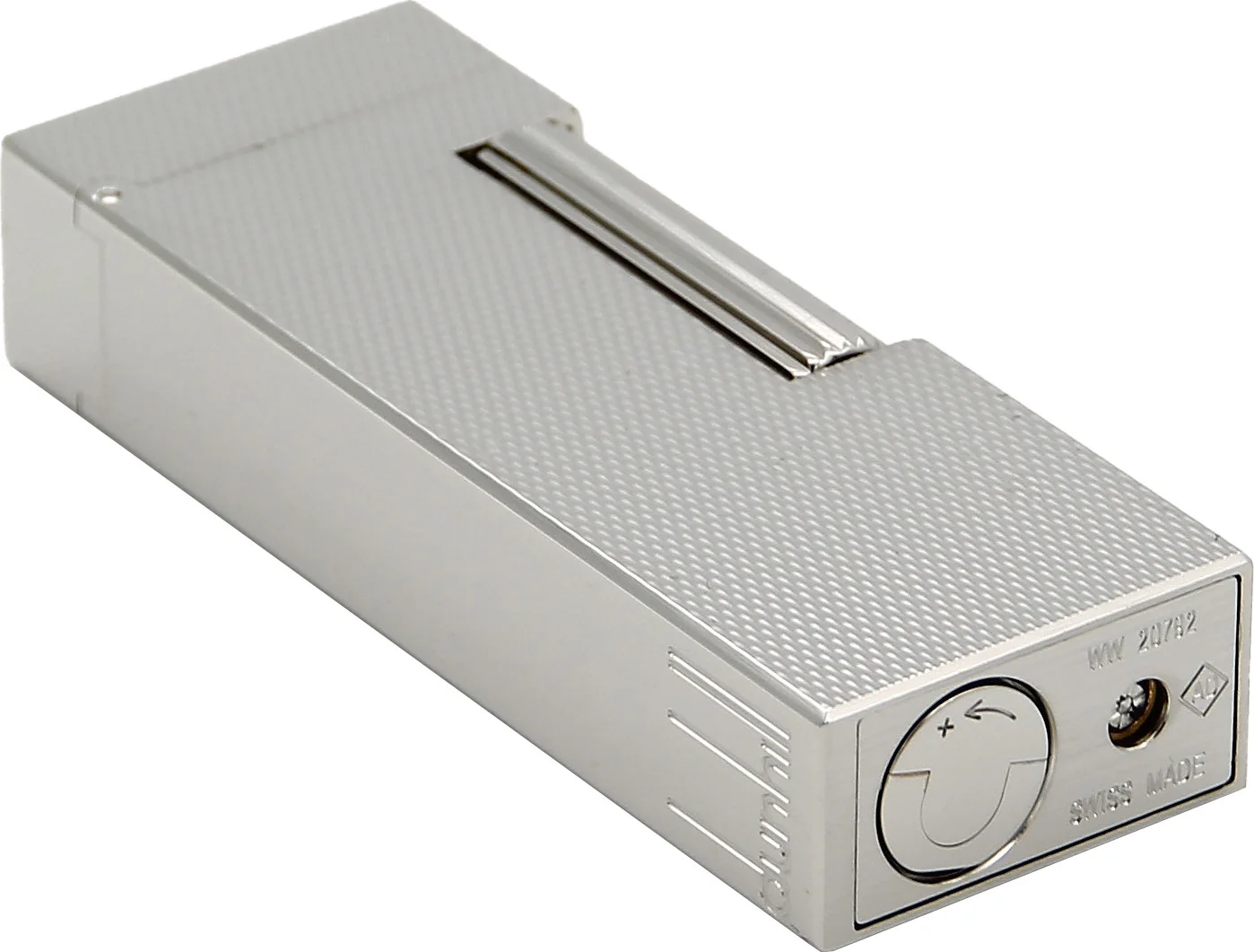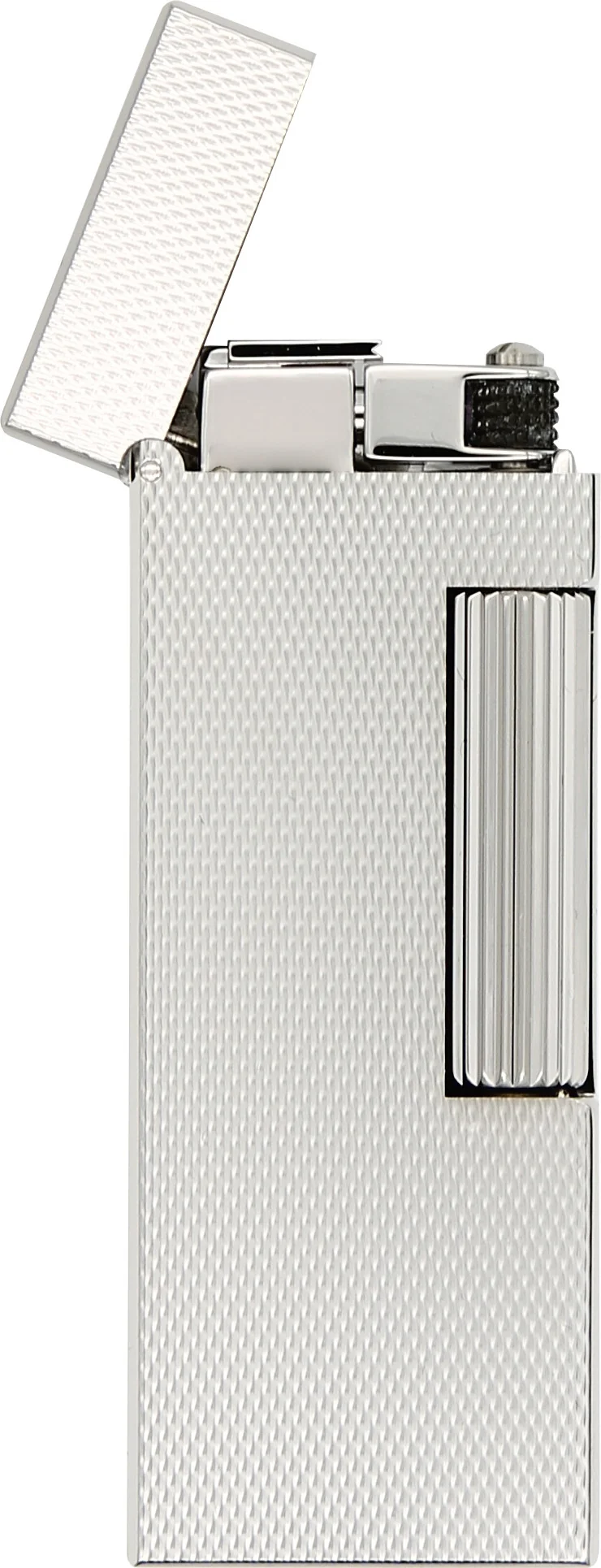 The combination of finely patterned surfaces on the front and back and highly polished, smooth sides gives the lighter its elegant, distinctive appearance. The Dunhill brand logo is finely engraved on one side. The ignition is protected from dust and dirt by a cover, which further increases the service life of the mechanism.