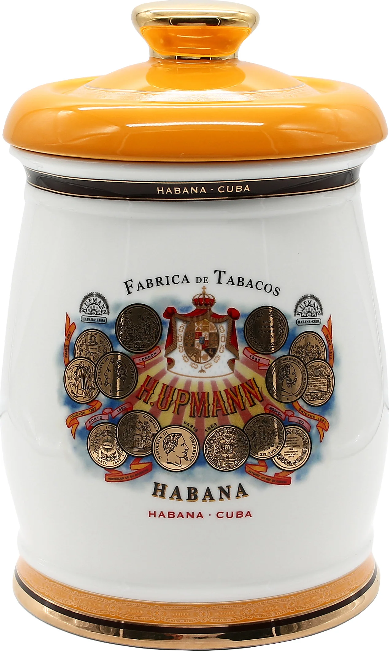 Included is a round sponge humidifier, which attaches magnetically to the lid. The lid itself is equipped with a sealing ring to help maintain a stable internal climate. The jar's design was created by Nelson Alfonos for Habanos S.A. and incorporates the typical lines and color palette of the H. Upmann brand.
