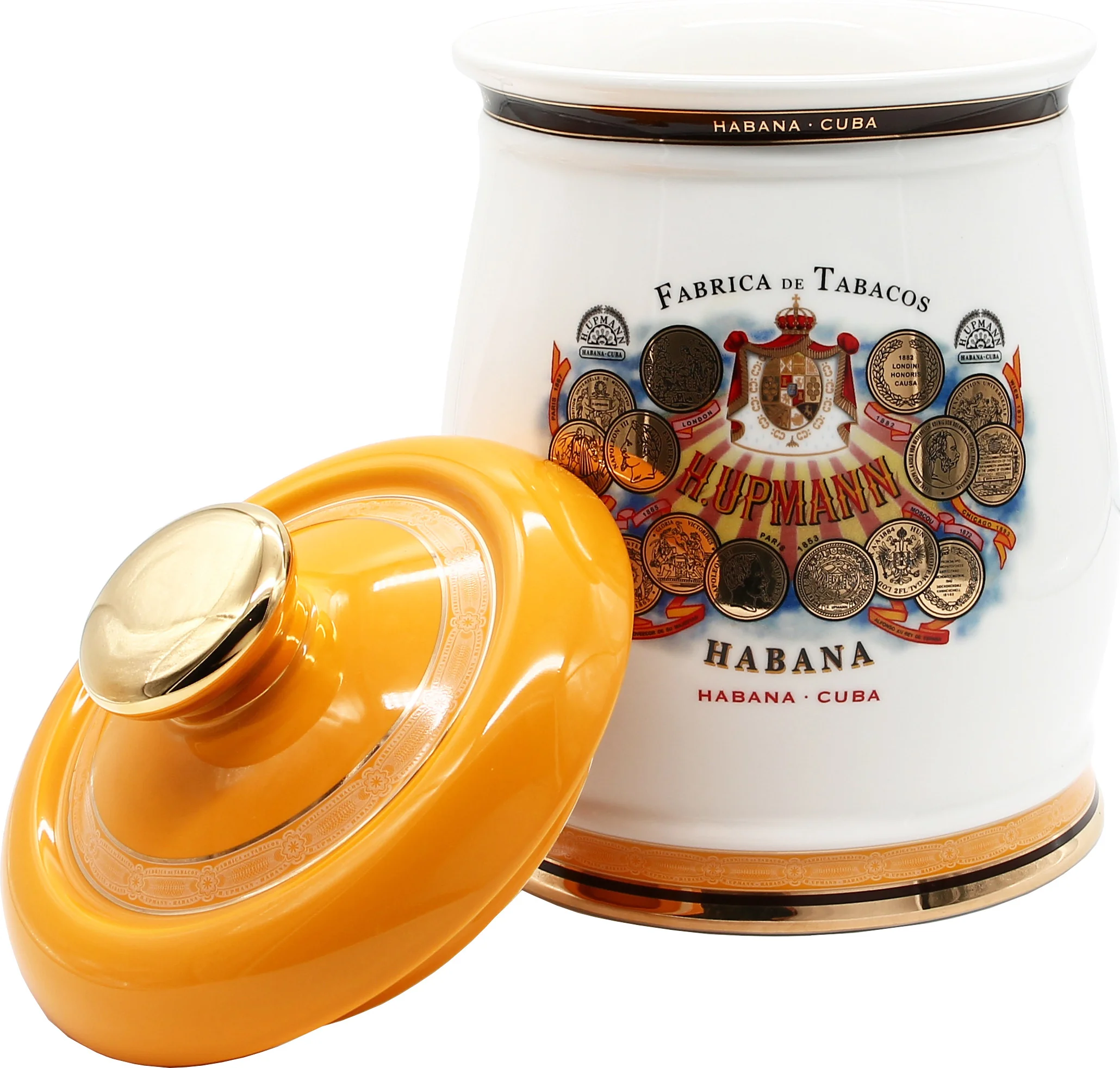 The H. Upmann Porcelain Jar is a functional and attractively designed storage container from the long-established Cuban brand H. Upmann. It features a white base color complemented by the brand's signature orange accents. The distinctive H. Upmann logo is prominently displayed on the front, clearly identifying the jar as belonging to the brand.