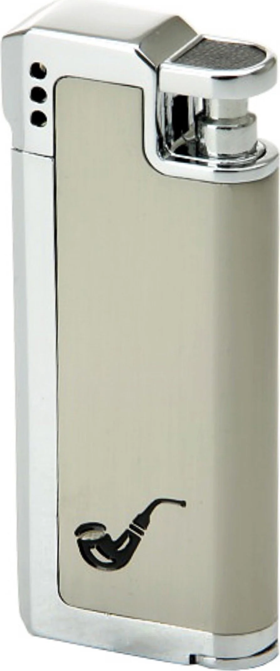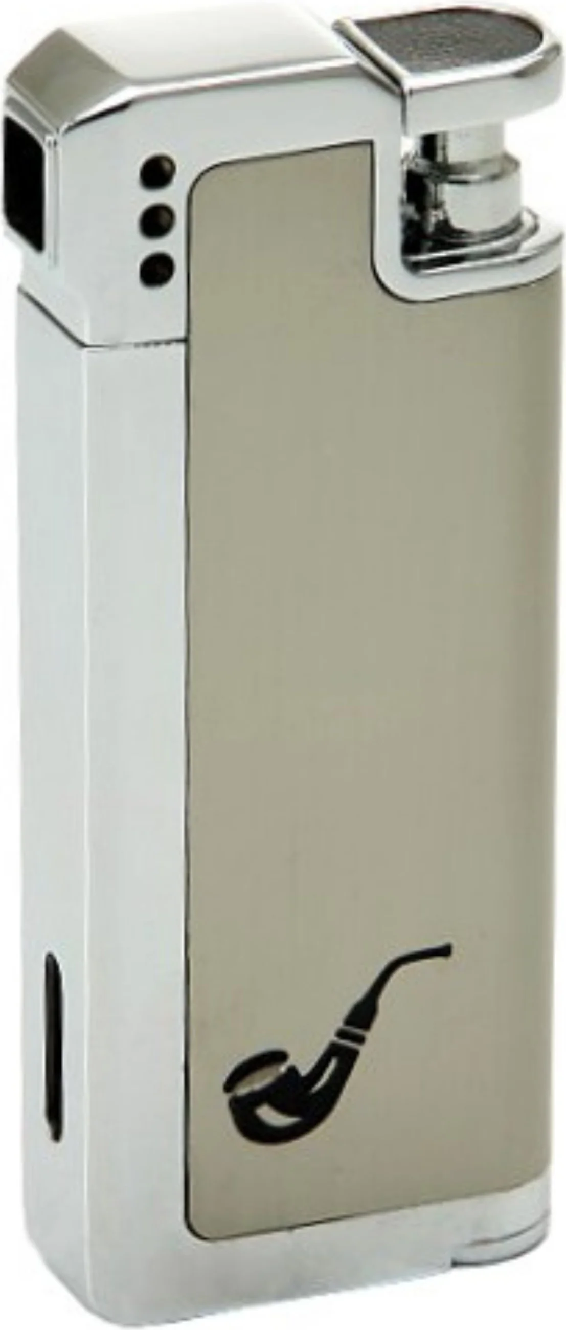 Praktikus pipás öngyújtó pezsgőszínben, fényes ezüstszínű díszítőelemekkel – ideális pipázók számára. A házon lévő pipaábrázolás azonnal egyértelművé teszi a használati célt. Az oldalt elhelyezett gyújtás lehetővé teszi a pipa könnyed és biztonságos meggyújtását anélkül, hogy megégetné az ujjait.