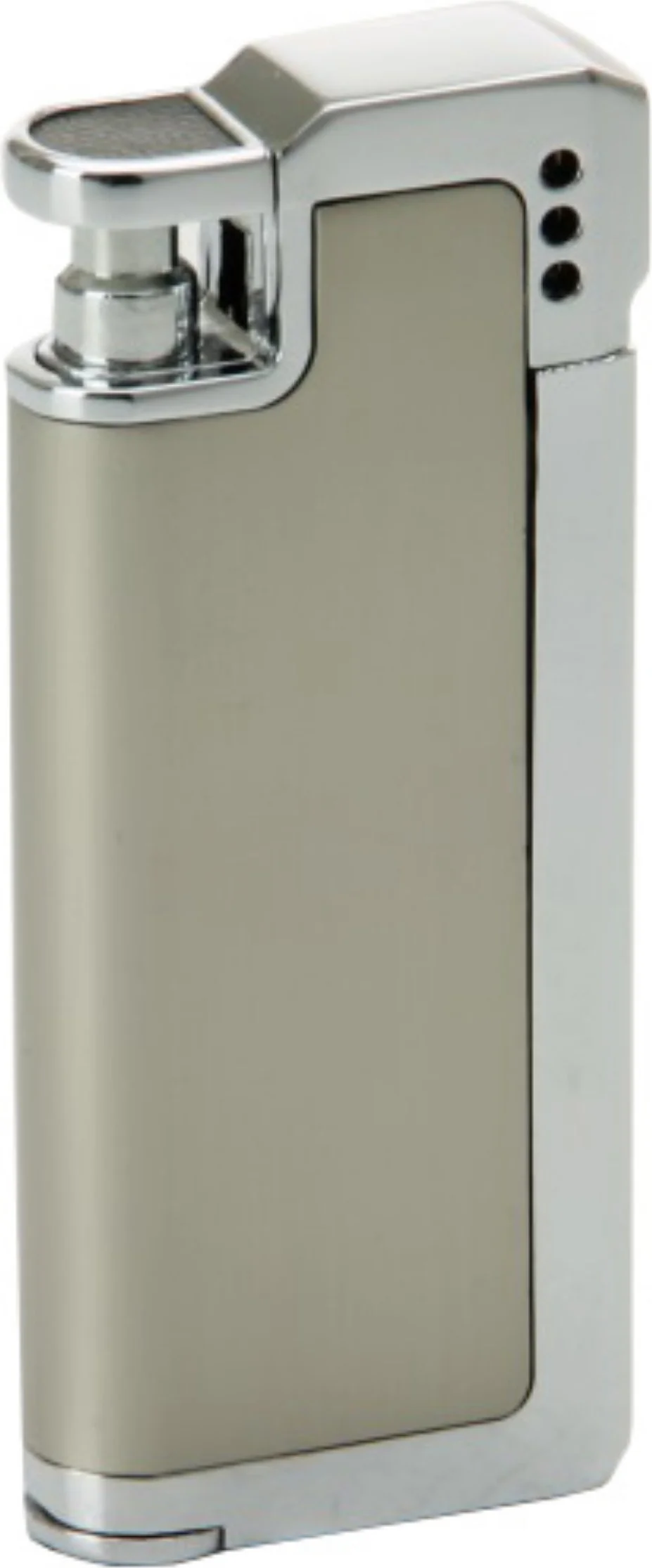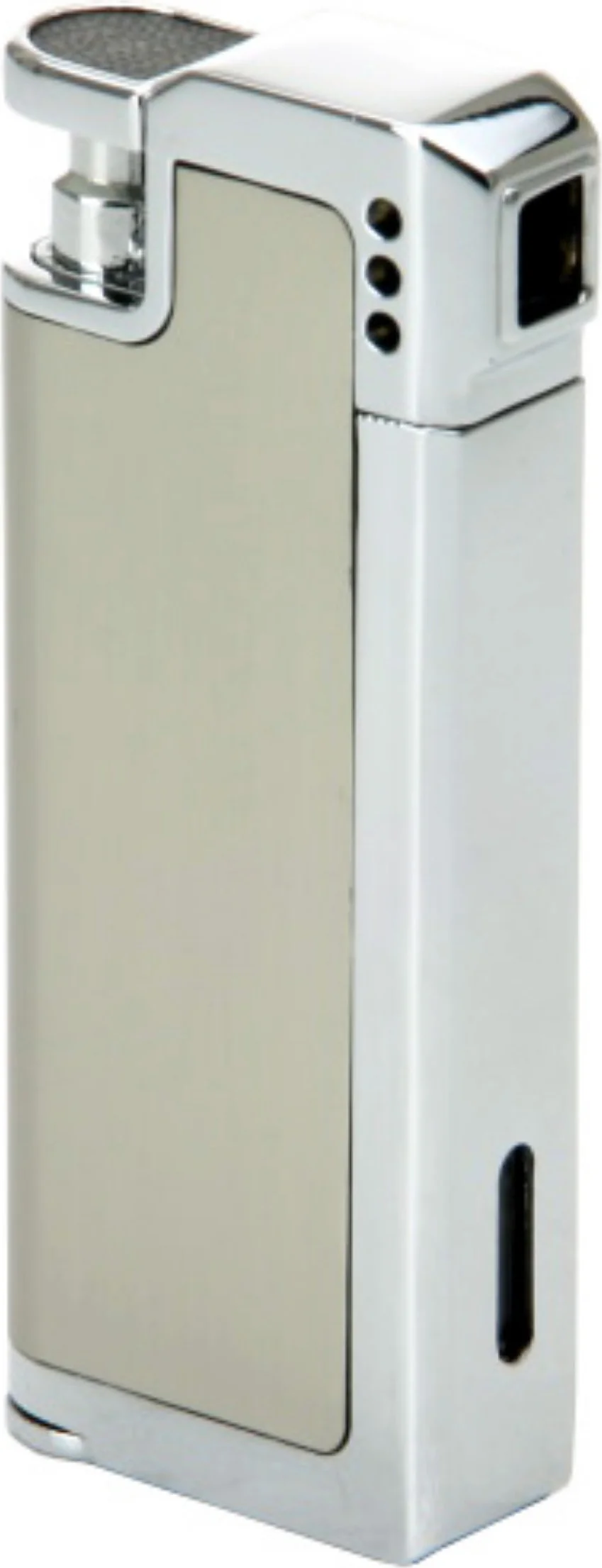 Az oldalsó gázszintjelző mindig mutatja az aktuális gázmennyiséget, így sosem indul el üres öngyújtóval. Az utántöltő szelep és a láng erősségének szabályozási lehetősége az alján található.