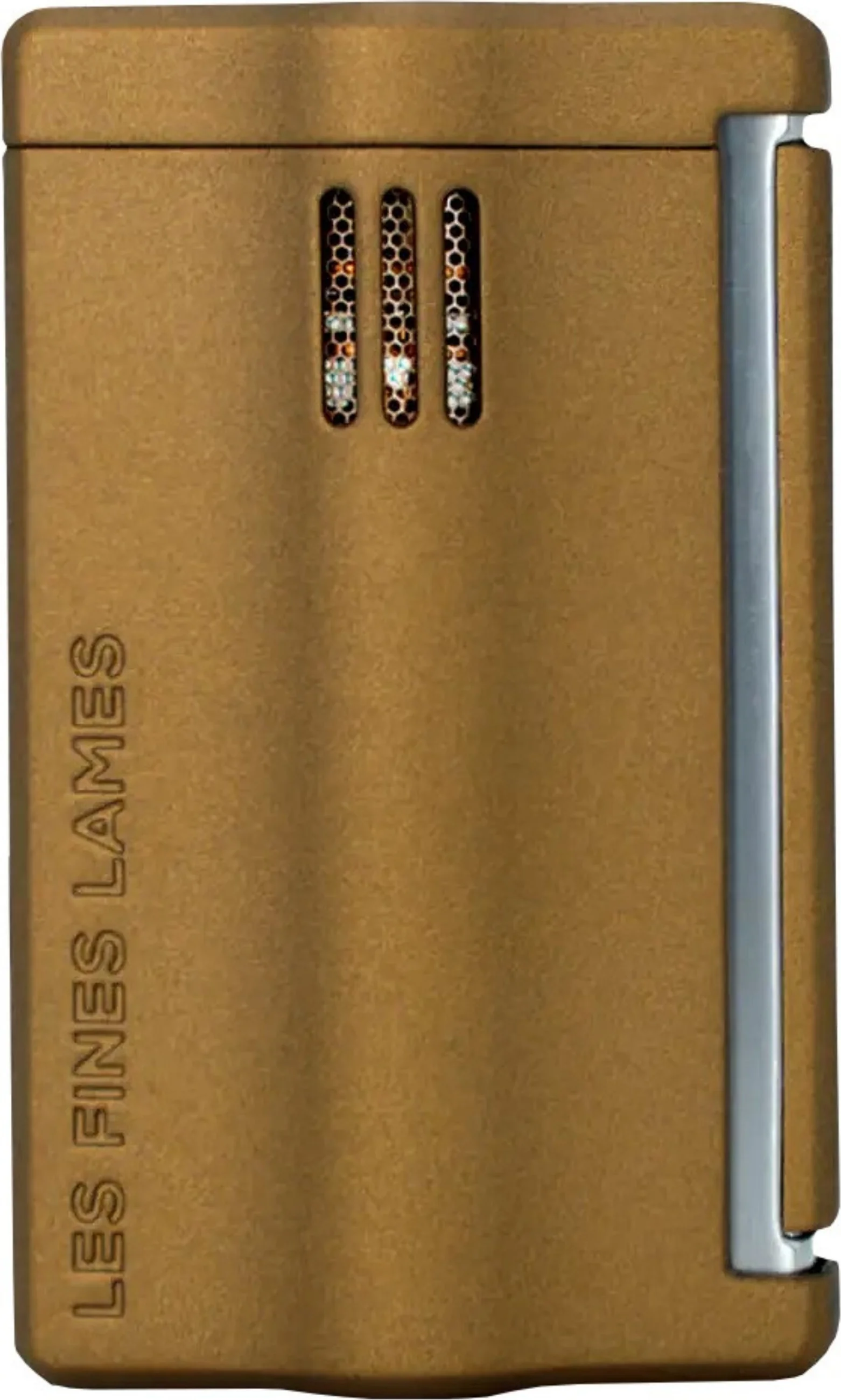 A Le Feu RS öngyújtó matt bronz kivitelben a francia Les Fines Lames márkától elegáns kiegészítő az igényes szivarkedvelők körében. A márka alapítója szerint az RS név a "Ring Shape" rövidítéséből jön, amelyet a szivargyűrű formája inspirált. Ez a dizájnkoncepció tükröződik a szokatlan kivitelében: felülről nézve az öngyújtó téglalap alakban kezdődik, egy ívbe megy át, majd ismét téglalap formában végződik – egy félreérthetetlen vizuális kijelentés.