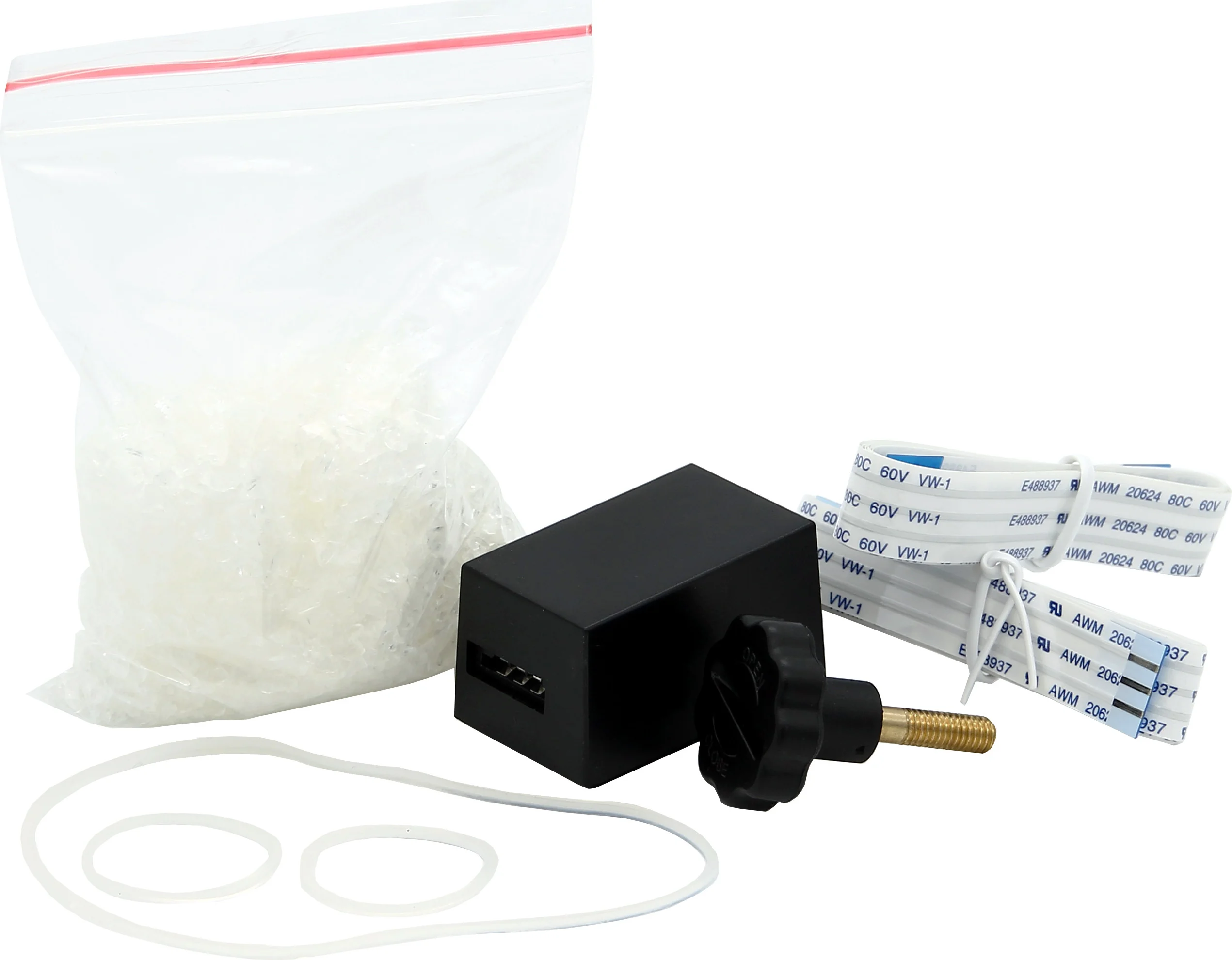 The kit includes a pack of crystals for the water tank. These ensure even humidity distribution. The contents of the pack are designed for multiple replacements. For hygienic reasons and to maintain the humidifier's full performance, regular replacement of the crystals is recommended. Also included is a three-piece set of sealing rings, which ensures a tight seal between the tank and the fan unit. This keeps the system functioning reliably and efficiently. Additionally, the maintenance kit includes a double set of flat cables with the matching connector for the power supply, making it ideal for replacing or renewing components as needed. A spare screw for securely attaching the water tank to the top completes the set.