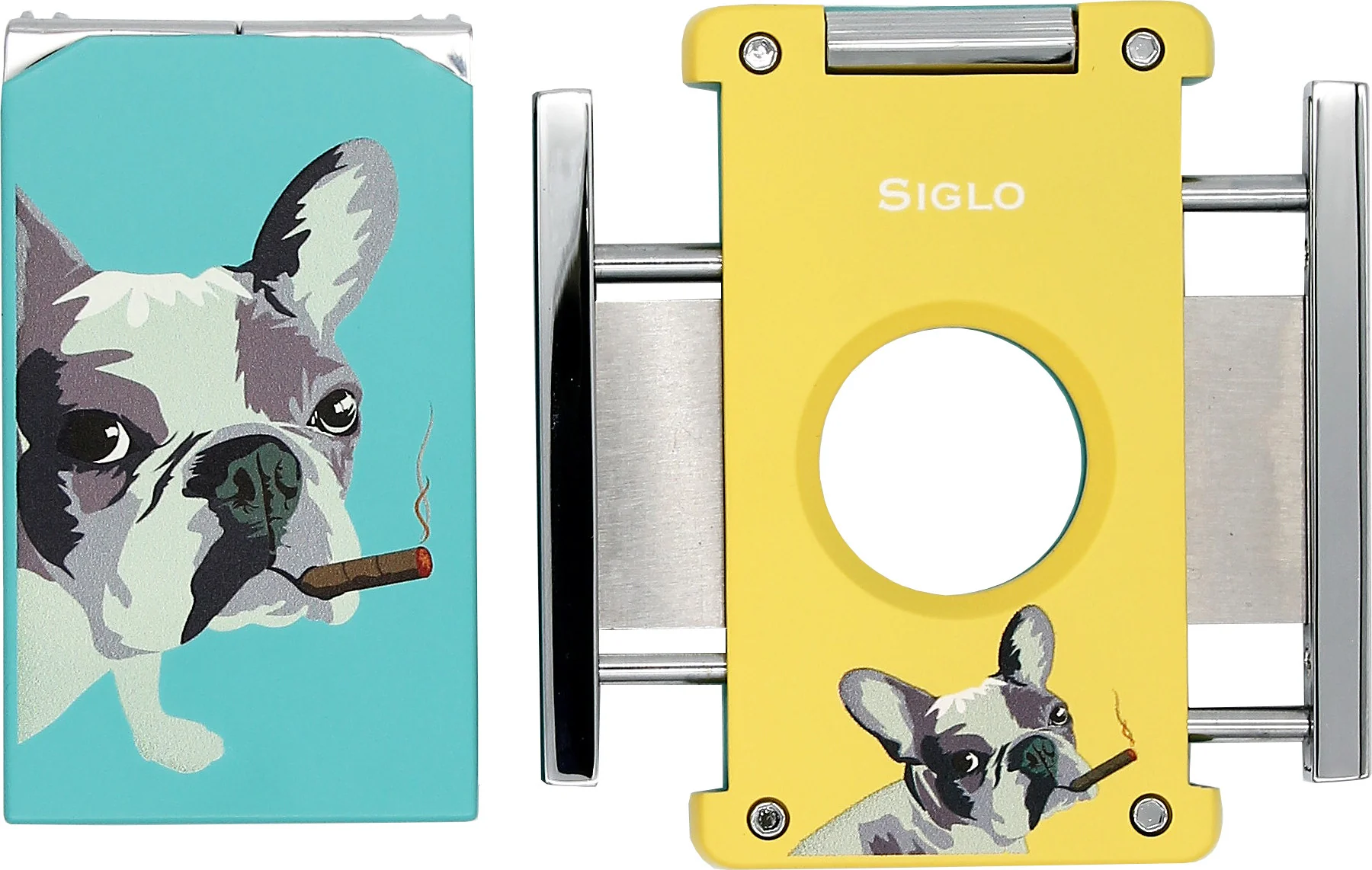 The Siglo Dog Lighter and Cigar Cutter Set is a striking and creatively designed duo for cigar lovers. Both accessories feature a smoking French Bulldog in pop art style. The backs echo the motif with a typical polka dot pattern, emphasizing the artistic character of the design. The set immediately catches the eye and adds a modern, humorous touch to any cigar collection.