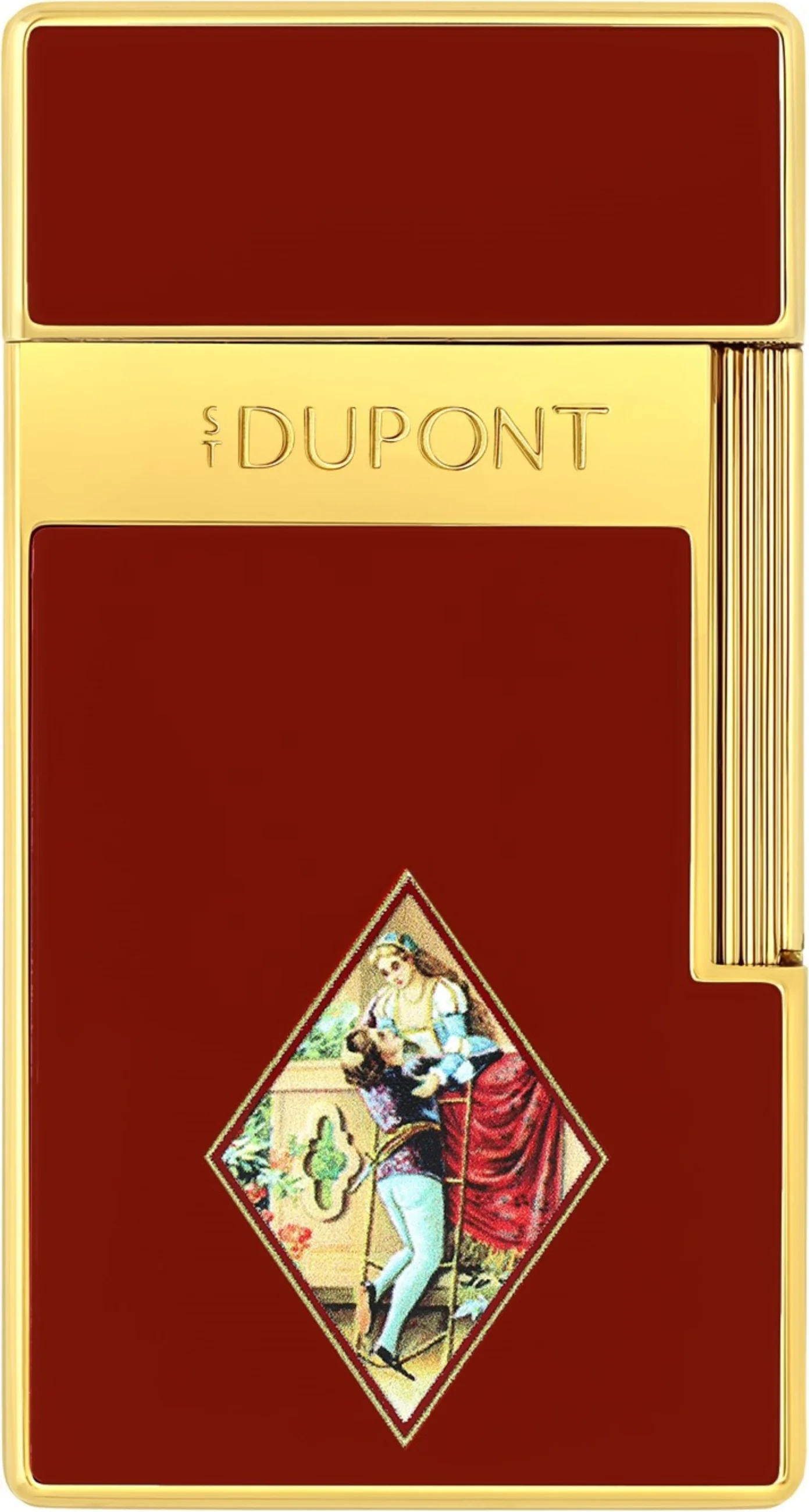 Az elülső oldalon látható a jellegzetes balkonjelenet, amely Rómeó és Júlia drámai szerelmi történetét szimbolizálja – valódi figyelemfelkeltő motívum. Közvetlenül fölötte helyezkedik el a modernizált S.T. Dupont logó, amelyet 2025-ben új, korszerű dizájnnal alkottak meg.