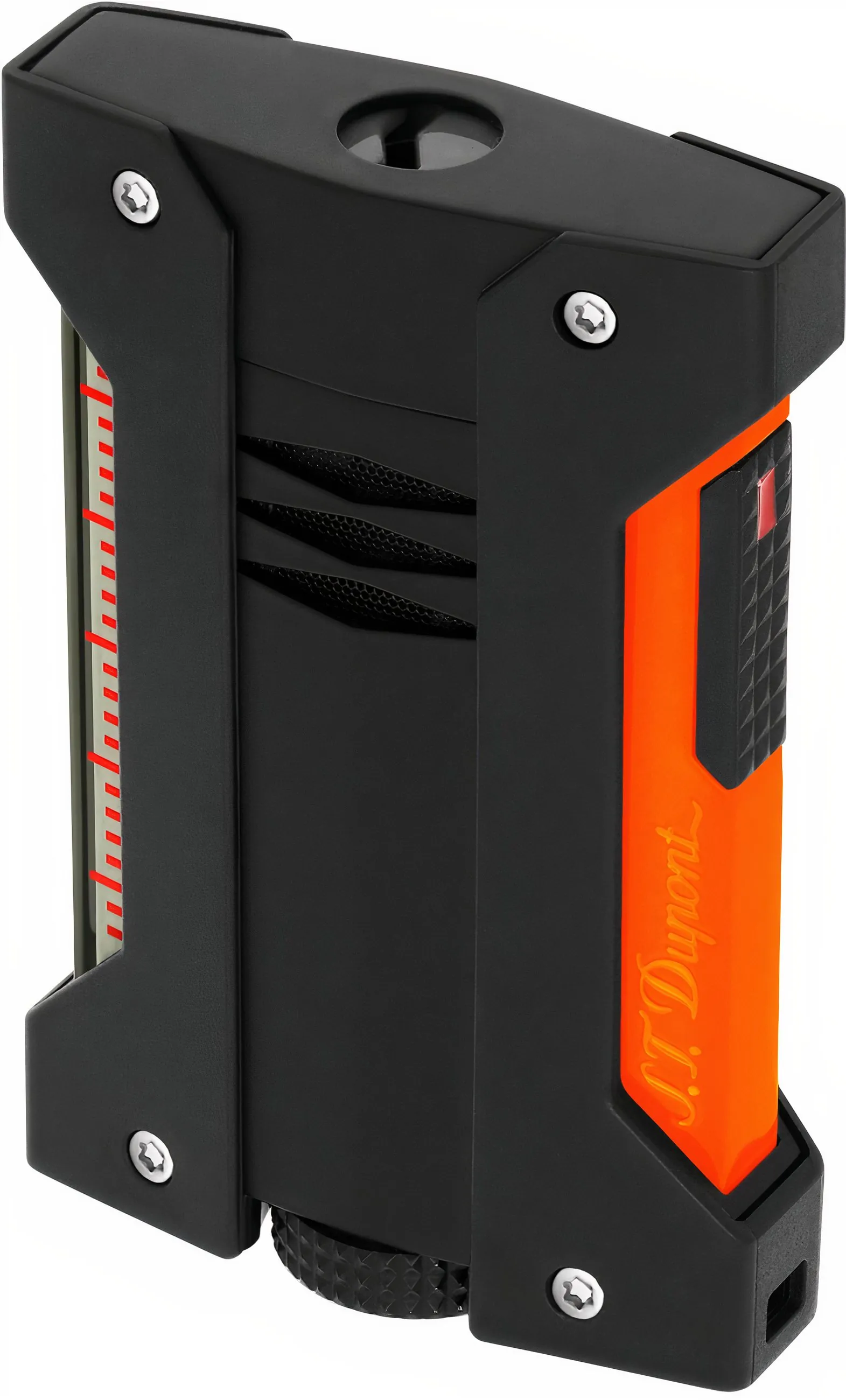 Erőteljes, szélálló jet lángja biztonságos és egyenletes gyújtást tesz lehetővé a külső körülményektől függetlenül. Az oldalsó gázszintablak segítségével mindig szemmel tartható a töltöttségi szint, így időben elvégezhető az utántöltés. Az automatikus védőfedél, amely megóvja a gyújtónyílást a portól és szösztől, további védelmet nyújt, és automatikusan nyílik, amikor az oldalsó gyújtószerkezetet megnyomják. Az ergonomikus forma és a masszív ház különösen kényelmessé teszi a használatot. Az öngyújtó utántölthető, az utántöltőszelep és a láng erősségének szabályozására szolgáló csavar az alján található. Az optimális teljesítmény érdekében a S.T. Dupont piros gáz (REF. 000436) használata ajánlott.