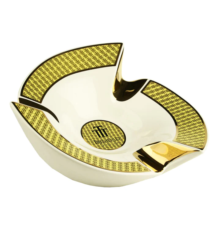 Trinidad hamutartó Habanos Merüljön el a legfinomabb szivarkultúra világában a Habanos Trinidad hamutartójával. Ez a fehér porcelánból készült, sárga és arany akcentusokkal díszített remekmű különleges aszimmetrikus formájával ragadja meg a tekintetet, igazán szemet gyönyörködtető. Az ikonikus Trinidad logó zökkenőmentesen van beépítve a hamutartóba, ami összetéveszthetetlen identitást kölcsönöz neki. Ezt a hamutartót Nelson Alfonso, a szivartervezés elismert művésze tervezte, így ez a hamutartó önmagában is egy műalkotás. Három aranyszínű szivarnyereggel rendelkezik, így nem csak praktikus funkcionalitást, hanem egy csipetnyi luxust is kínál. A 868 gramm súlyú és 22,5 x 22,5 x 7,5 cm-es méretével szilárd és precíz kivitelezésről tanúskodik. A Trinidad hamutartót egy vonzó díszdobozban szállítjuk, így a termék egy áhított gyűjtői darab vagy ideális ajándék a szivarrajongók számára. Szerezze be a Habanos Trinidad hamutartót, és hagyja magát elbűvölni egyedi dizájnjával és kézműves kiválóságával. Minden szivarrajongó számára kötelező darab.