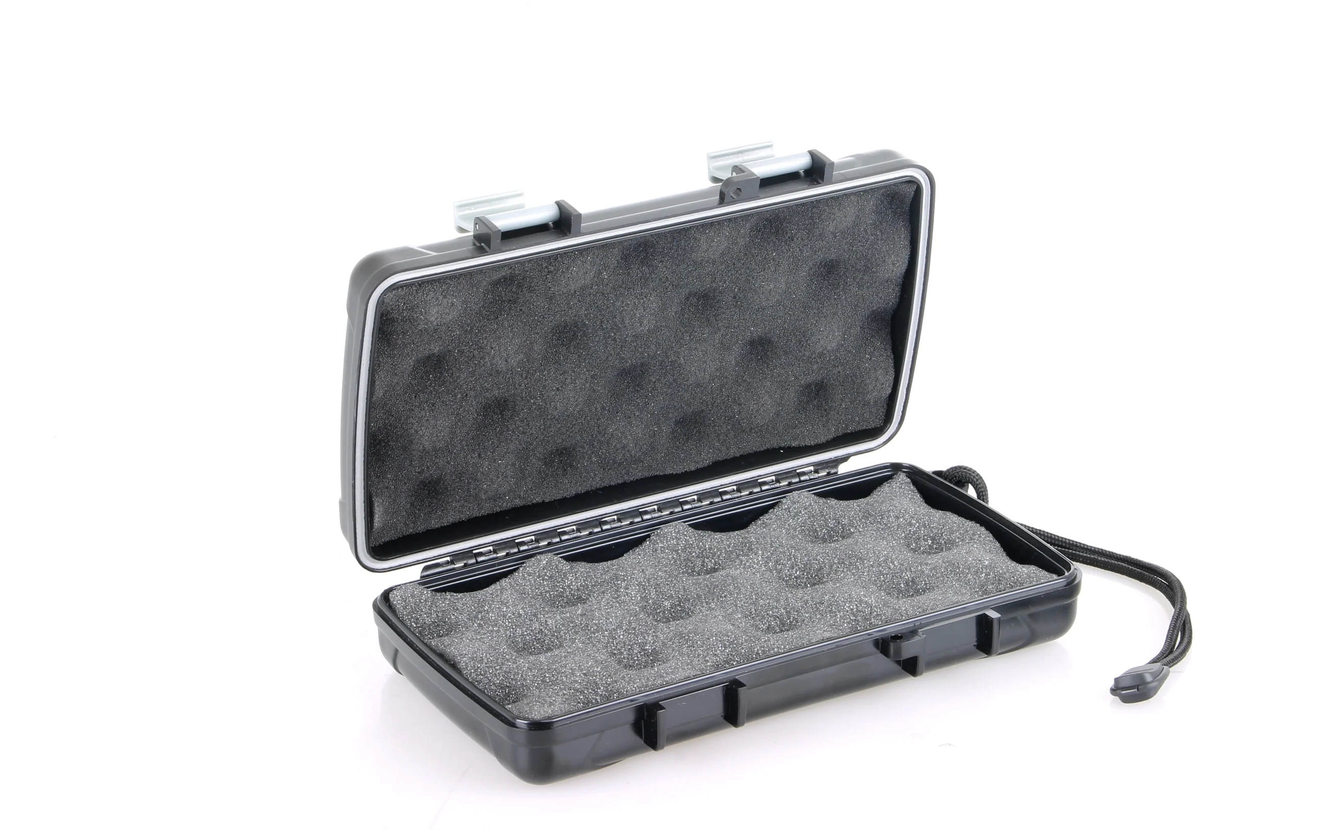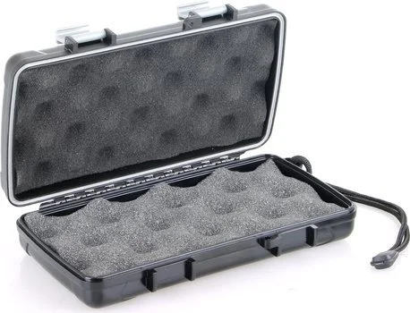Ez a szuperkemény ABS műanyagból készült klasszikus fekete utazási humidor biztosítja a szivarok számára a szükséges védelmet, hogy az utazás minden viszontagságát kibírják. A rozsdamentes acél zsanérok és a robusztus kapcsok szorosan zárva tartják a tárolót, lég- és vízzáró lezárást biztosítva. A formázott zárgyűrűvel még nagyobb biztonságot ad, biztosítva, hogy szivarjai érintetlenek és tökéletesen megőrzöttek maradjanak, amíg készen nem áll arra, hogy pihenjen valamelyik ízletes kincsével.