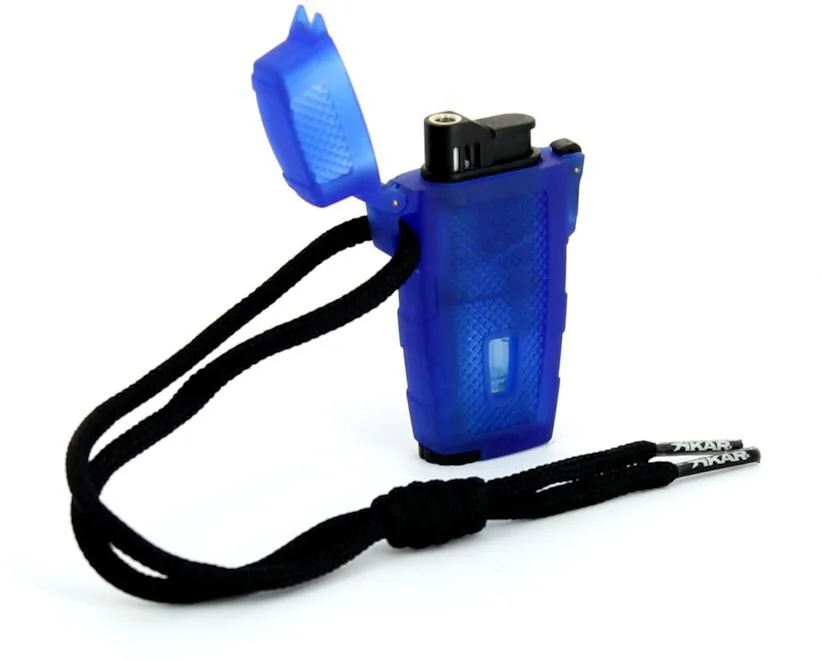 Xikar öngyújtó Stratosphere modell kék színben. Ez a viharálló kültéri öngyújtó turbó lánggal gumiborítású testből áll, és könnyen látható szintjelzővel rendelkezik.